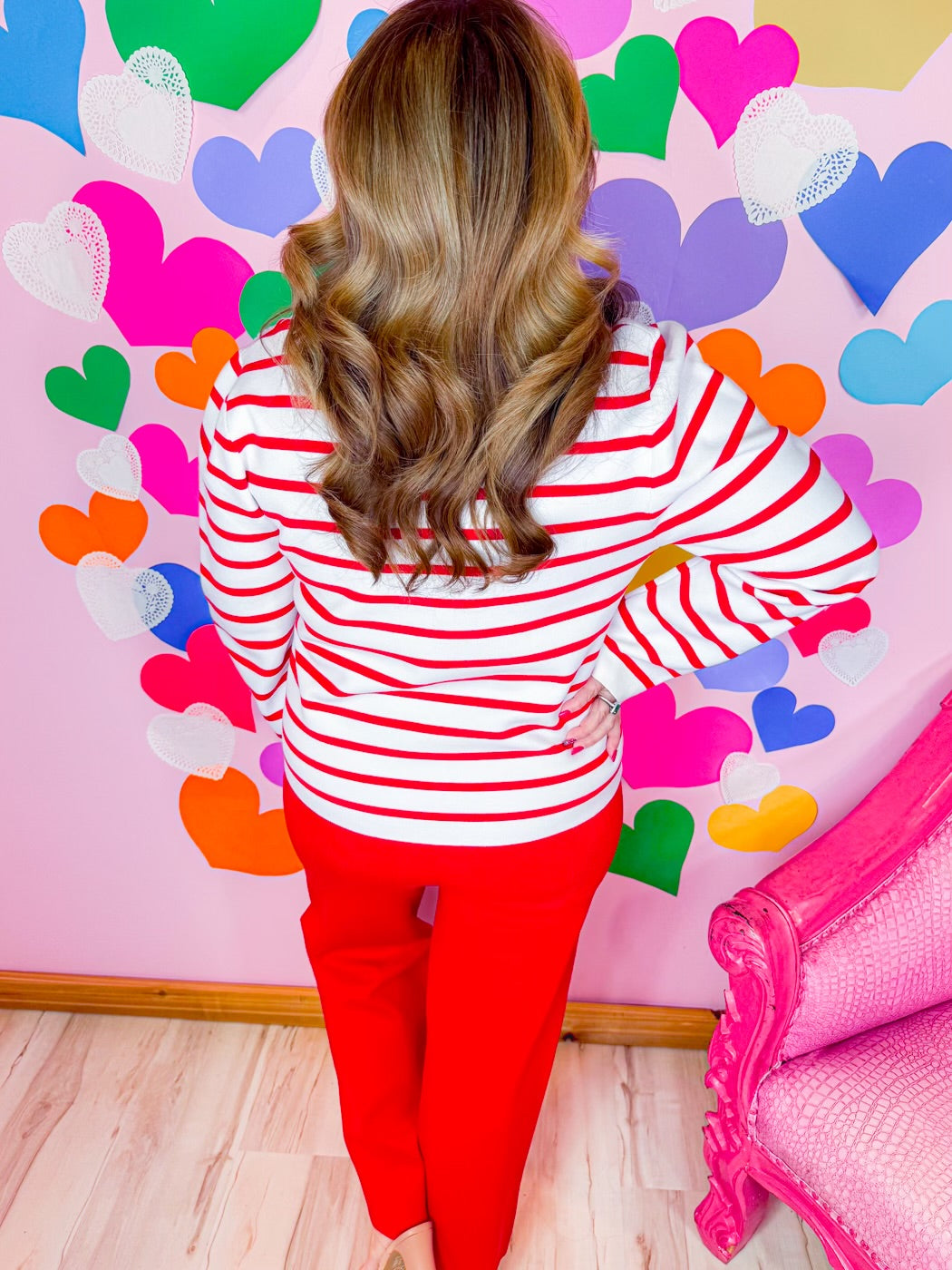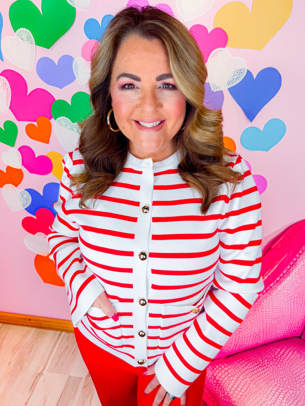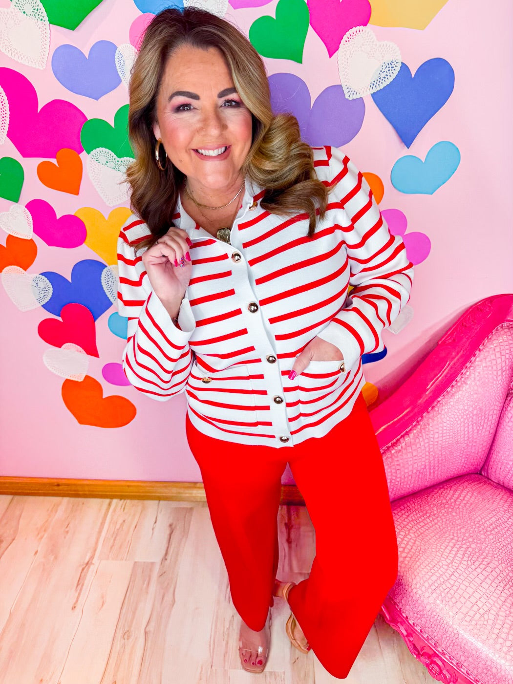 Timeless with a statement twist, The Vivianne Stripe Cardigan is the perfect blend of chic and eye-catching. Featuring bold red and white stripes, this cardigan is elevated with luxe gold statement buttons that add a refined, fashion-forward touch. Crafted from a soft, comfortable knit, it’s ideal for layering while still standing beautifully on its own. Dress it up or keep it casual—this piece brings effortless sophistication to any look.