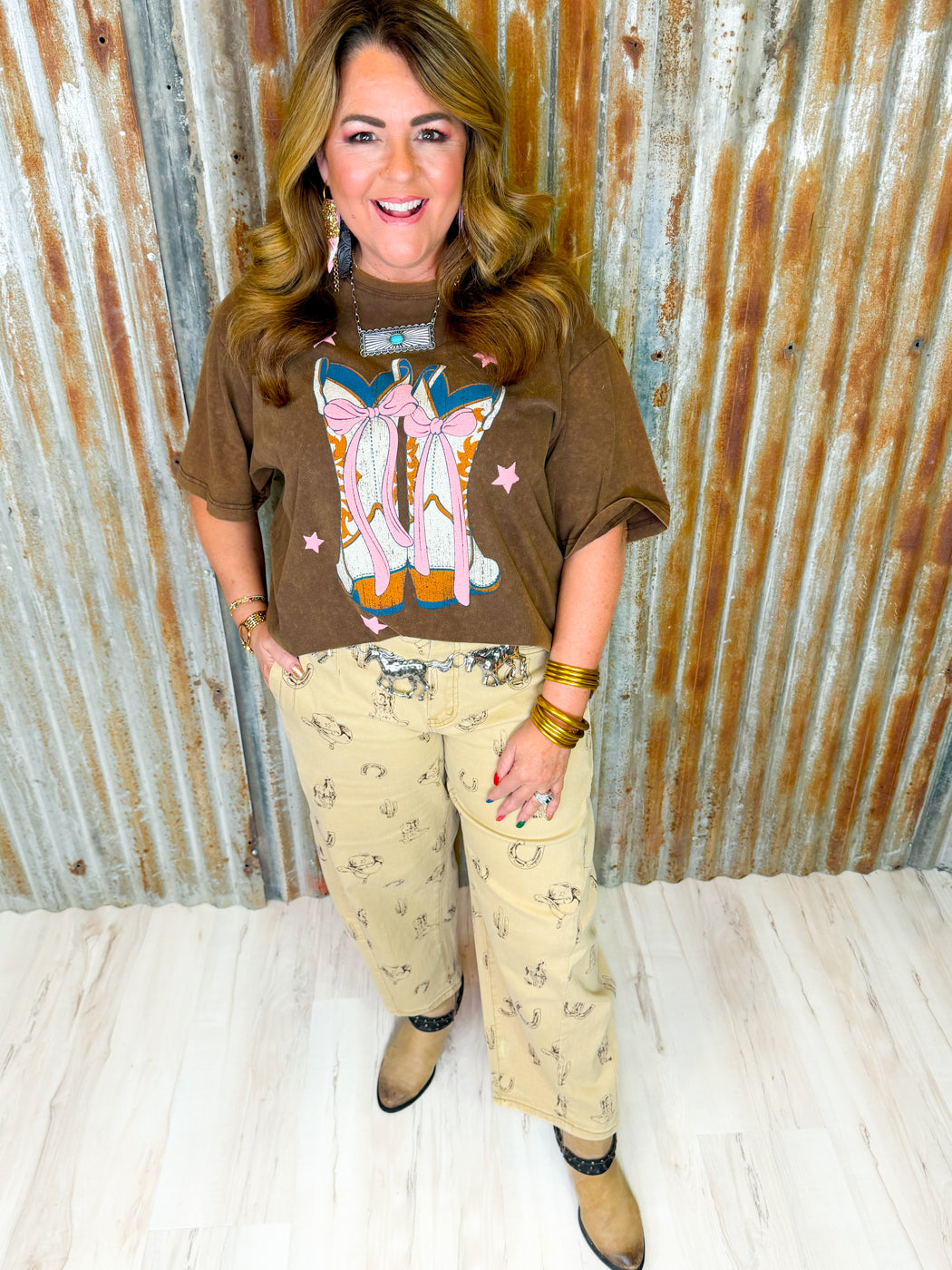 The Boot Scootin' Khaki Barrel Pants offer a relaxed fit with a barrel style design that creates a modern and easy silhouette. These printed pants feature a high waisted rise that provides comfort and a flattering shape. Functional pockets add convenience for everyday wear. The lightweight feel makes them suitable for a variety of occasions. Pair them with casual tops for daytime outings or elevate them with dressier pieces for a polished look. These pants are designed to transition through the season with ease, giving you a versatile option for any wardrobe!