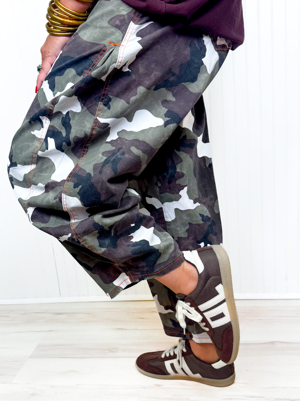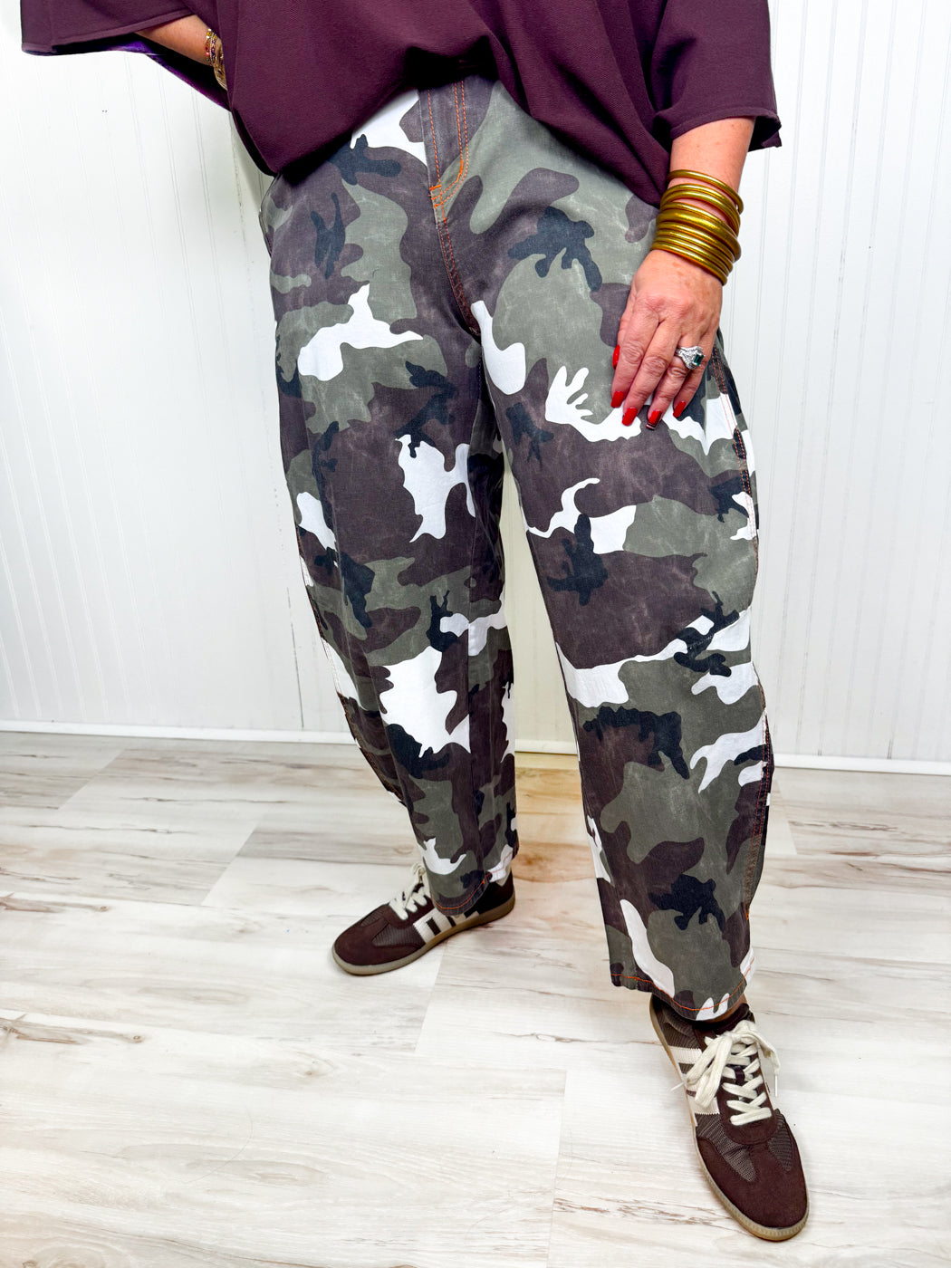 Hidden in the Snow Camo Pants feature an oversized fit with a trendy barrel-leg silhouette for a bold, fashion-forward look. Designed in a popular camo print blending black, brown, white, and grey tones, these pants make an effortless statement. Comfortable and easy to style, they’re perfect for elevating casual outfits with an edgy, on-trend vibe.