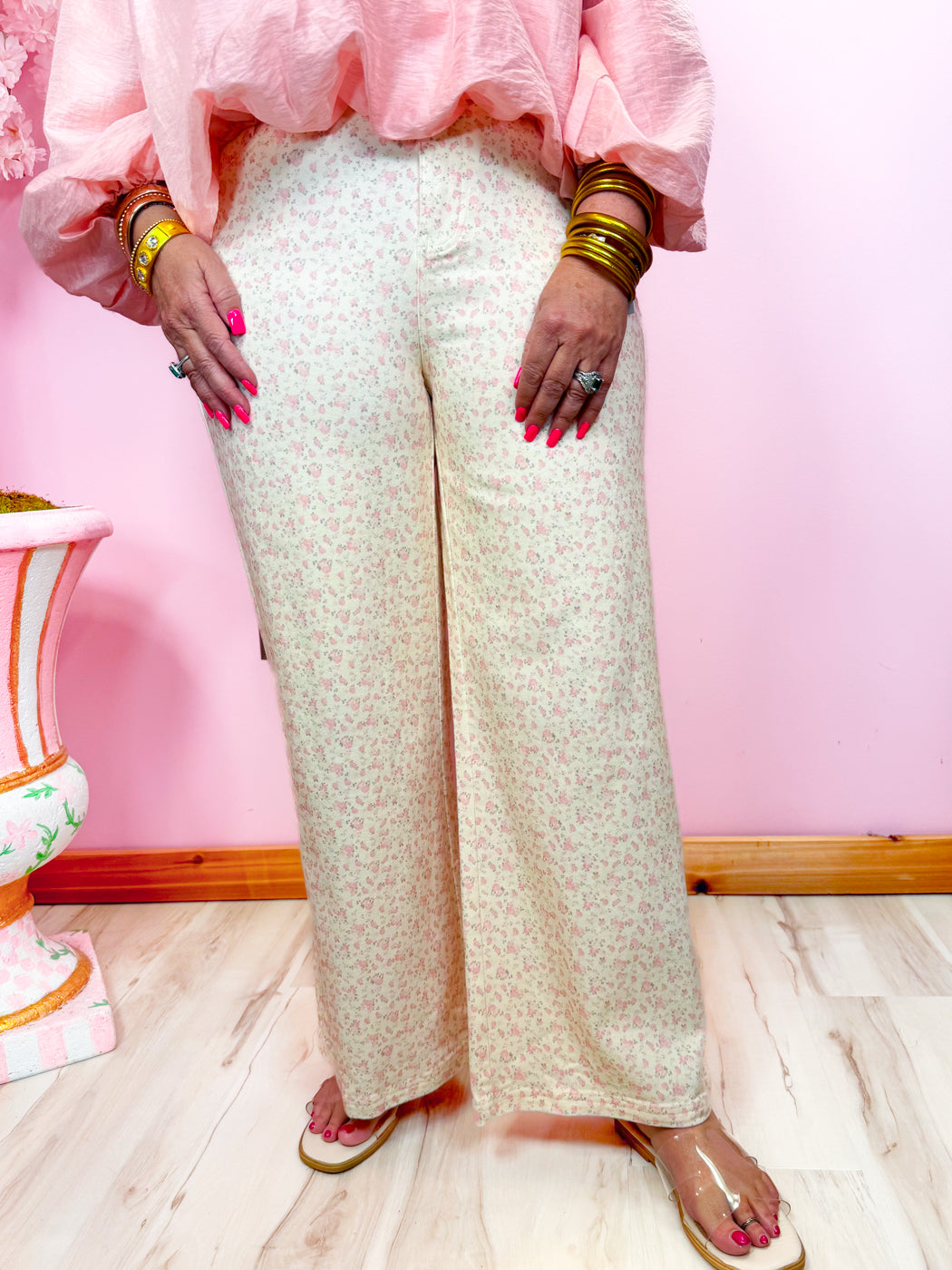 The Garden Daydream Trousers are made for sunshine days and sweet, standout style. Featuring a soft cream base with a pink floral print, these wide-leg pants bring a fresh, feminine feel to any outfit. With a hint of stretch for comfort and structure, they’re easy to dress up with a blouse or keep casual with a simple tee.