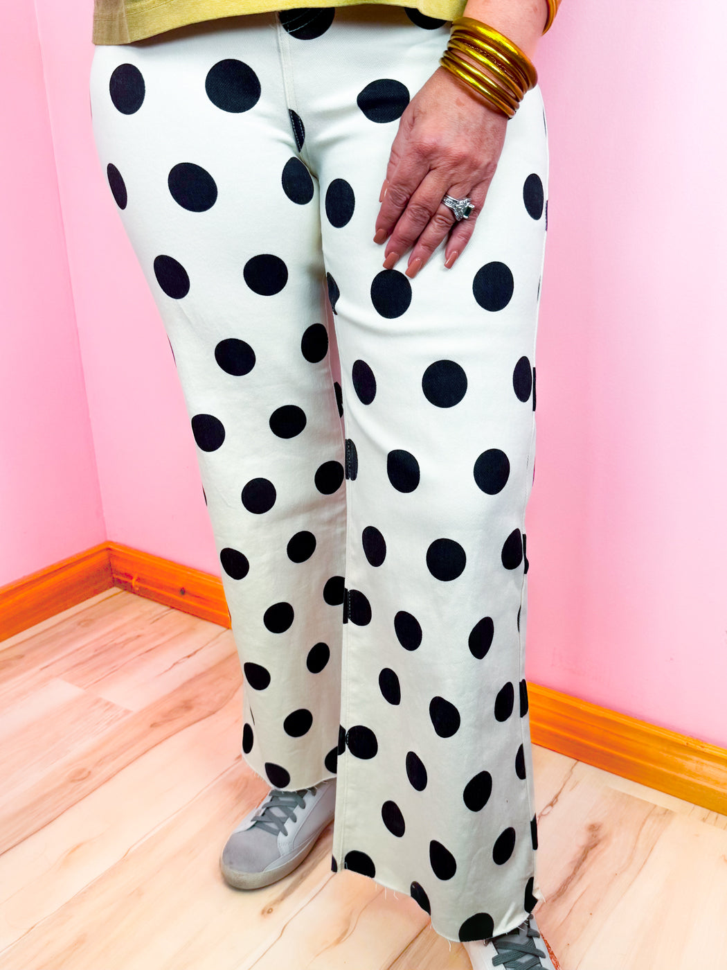 The Pretty in Polka Dots Jeans in Cream are the perfect mix of playful charm and everyday comfort. Featuring a soft neutral base with a classic polka dot print, these pants add a fun statement to your outfit while staying easy to style. The cotton-rich fabric offers breathable comfort with just the right amount of stretch for all-day wear. Dress them up with a blouse and wedges or keep it casual with a tee and sneakers — either way, they’re sure to stand out.