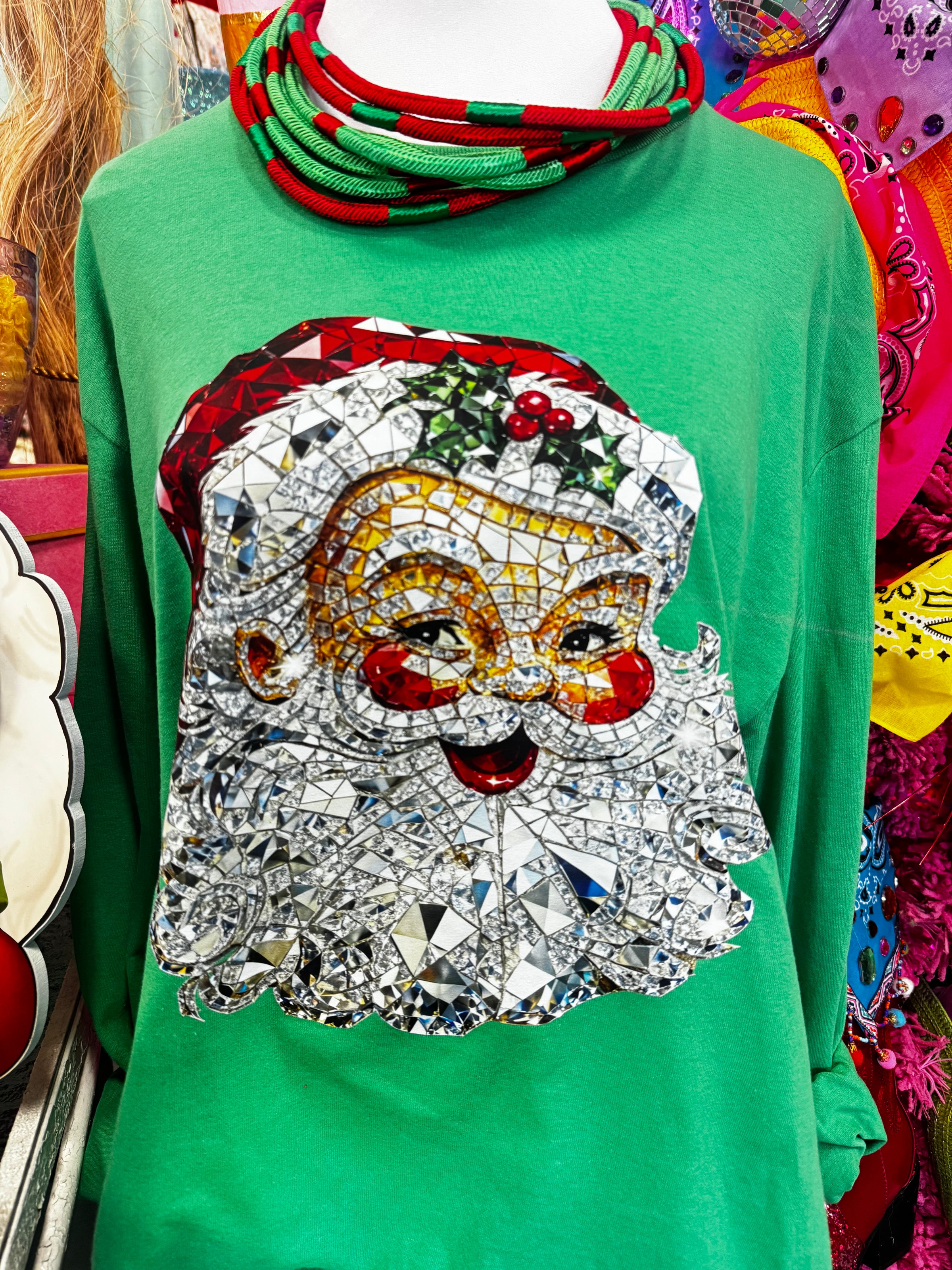 The Rockin' Rhinestone Santa Tee is a JerZee long sleeve tee featuring a Christmas print graphic that adds a festive touch to your wardrobe. Made from 50% cotton and 50% polyester, it offers a comfortable and easy fit for everyday wear. Pair it with jeans or leggings for a simple and effortless holiday look. This tee is designed for casual outings, seasonal events, and relaxed days at home!