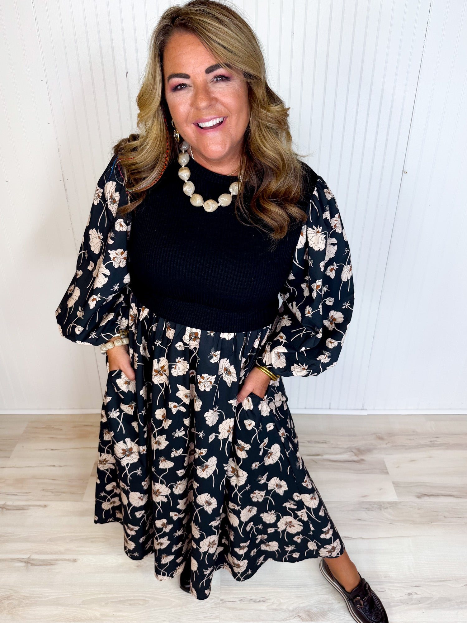 The Feels Like Fall Midi Dress is designed for comfort and style with a relaxed fit and bubble sleeves. The sweater-like bodice provides a cozy feel while maintaining a polished look. This midi-length dress features practical pockets, adding both convenience and function. Its versatile design makes it easy to dress up with heels or keep casual with booties. Perfect for everyday wear or special fall occasions, the dress combines style and ease in one effortless piece!
