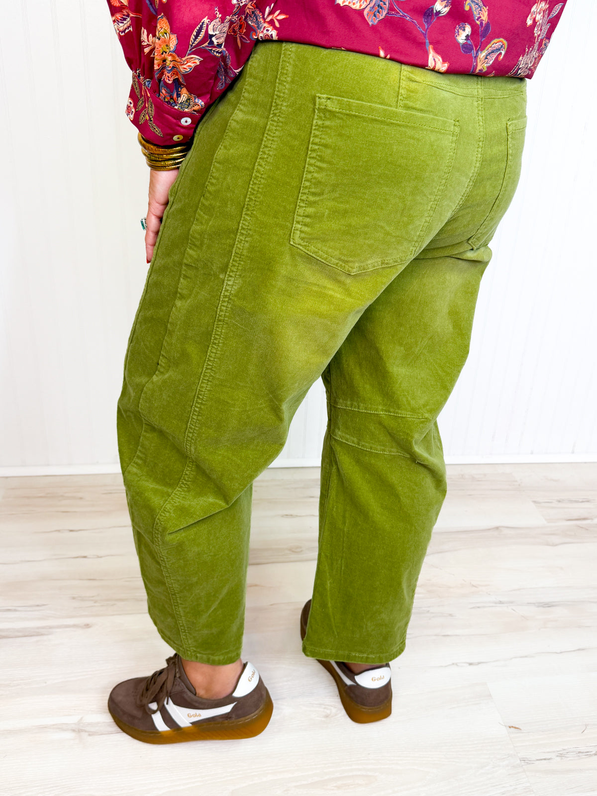 Autumn Evergreen Corduroy Barrel Pants feature a high rise fit with an oversized barrel leg for a modern and comfortable look. Made from soft corduroy, they include functional pockets for everyday convenience. These pants can be dressed up with a blouse and boots or worn casual with a cozy top and sneakers. A versatile choice for Thanksgiving gatherings and seasonal outfits!