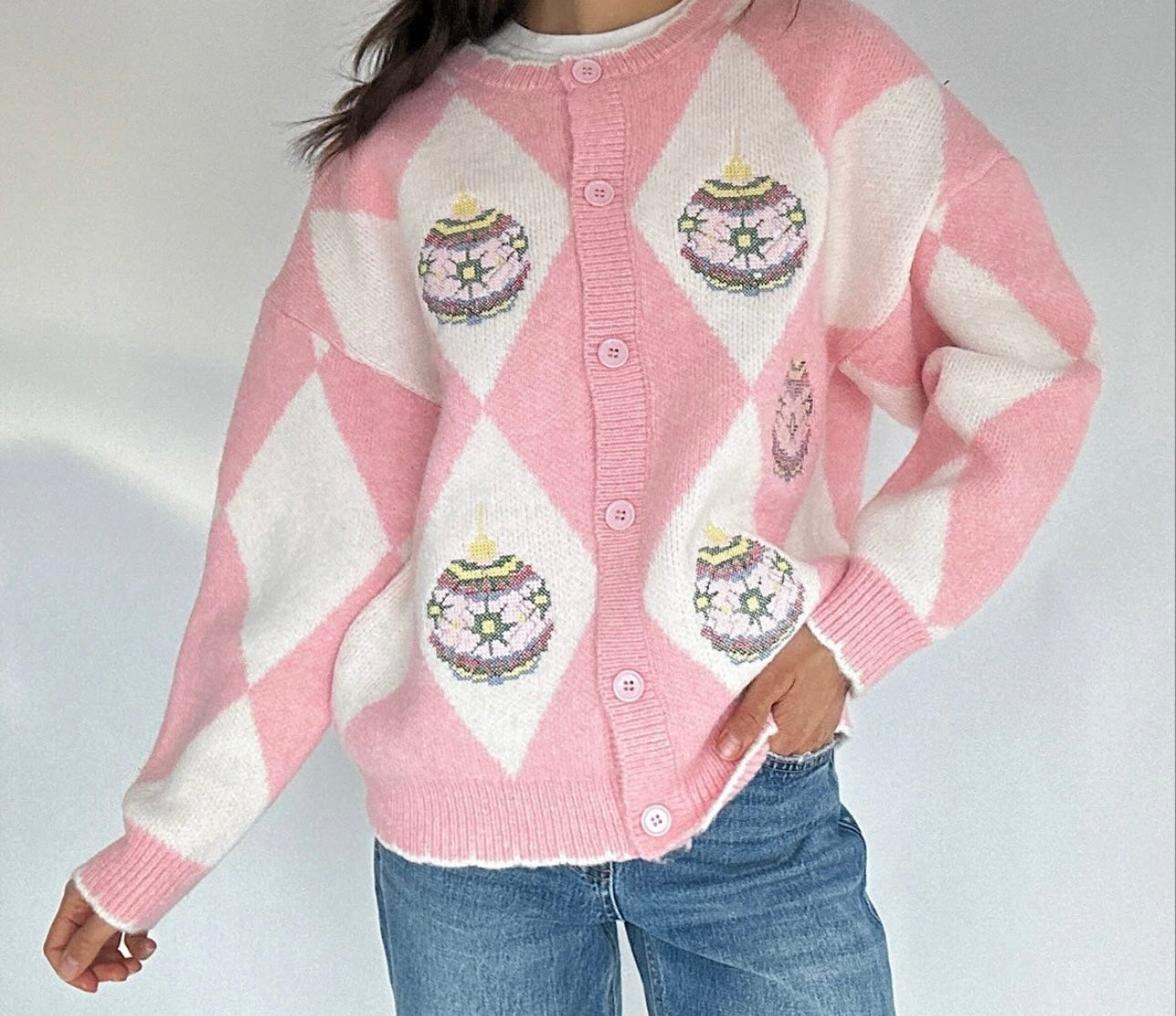 Pink Pastel Ornament Button Up Sweater features a relaxed fit and a soft, cozy feel. This piece is designed for easy layering during winter and Christmas. The button front adds simple detail while the pastel ornament pattern brings a festive touch. Pair it with jeans, leggings, or your favorite holiday pieces for a comfortable and seasonal look!