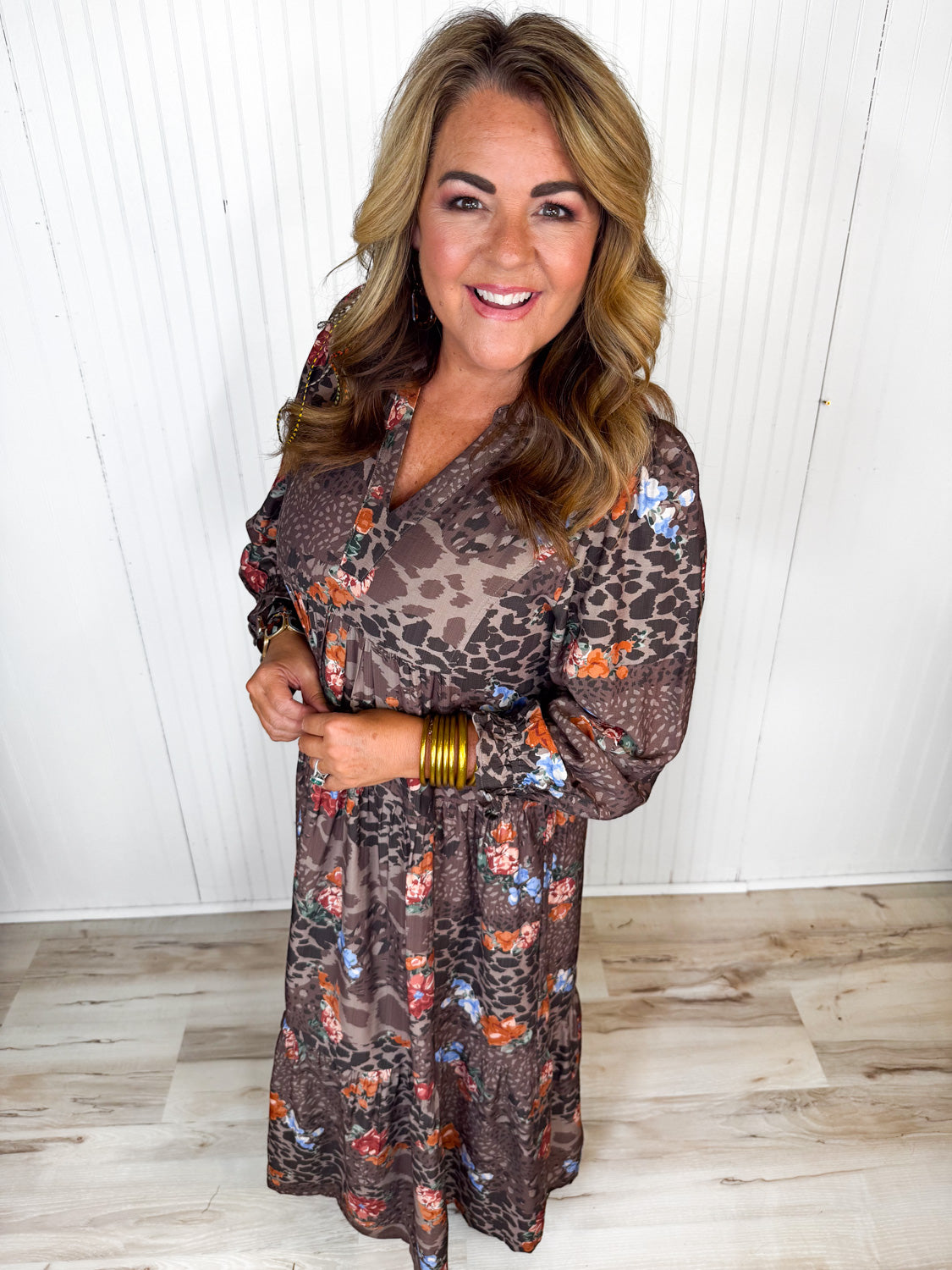 This long sleeve dress blends a mix of animal and floral prints in warm earthy tones of brown, tan, and rust, accented with hints of blue and green. The relaxed fit gives it a comfortable flow, while the v neck and softly gathered waist add shape. Bubble sleeves bring in a bit of volume at the wrists, and hidden side pockets add everyday function. Lightweight and lined for comfort, it’s a standout piece that transitions easily through the seasons.