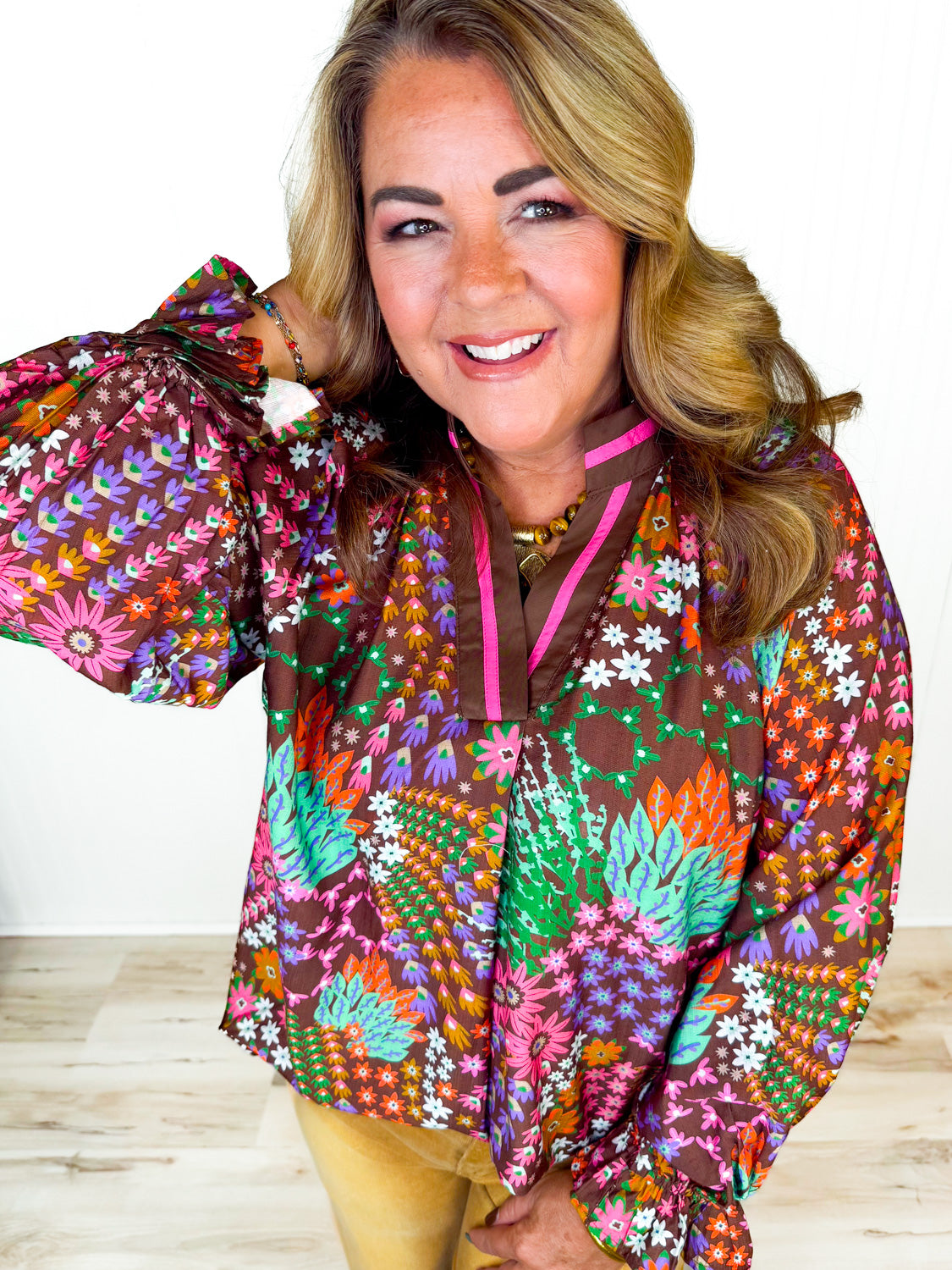 Effortlessly chic and full of charm, this boutique-style top features a relaxed silhouette for all-day comfort and style. Crafted from a soft, breathable chocolate brown fabric, it’s adorned with a lively ditsy floral print in shades of fuchsia, green, orange, and pink, adding a beautiful burst of color to your fall wardrobe.