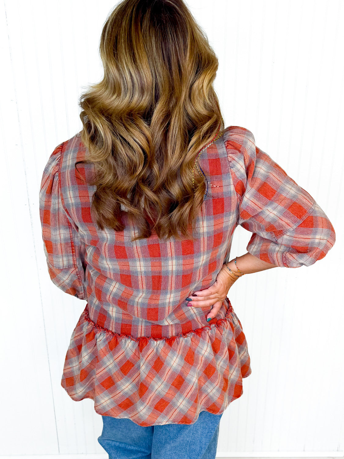 This plaid top features a warm mix of orange, cream, and soft blue in a classic fall pattern. The relaxed fit gives it an easy drape, balanced by a v neck with three tie closures down the front. Bubble sleeves add gentle volume, and the gathered hem creates a slight peplum shape that pairs well with denim or cords. Lightweight and comfortable, it’s a casual piece with just the right amount of detail.