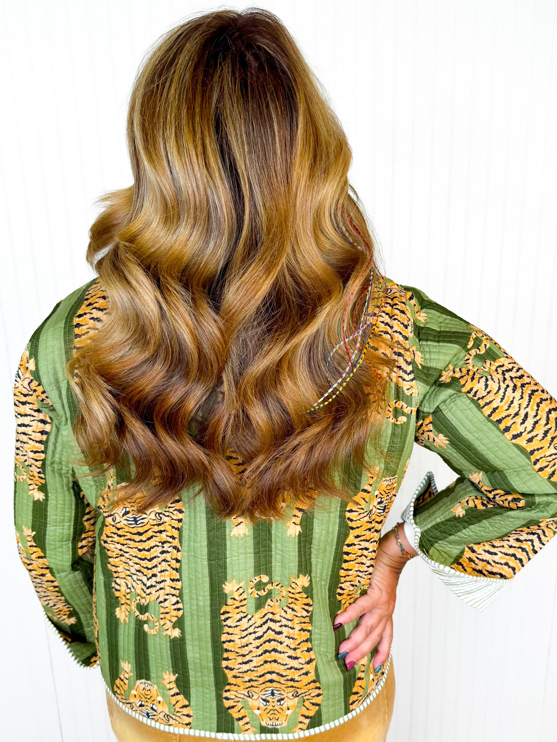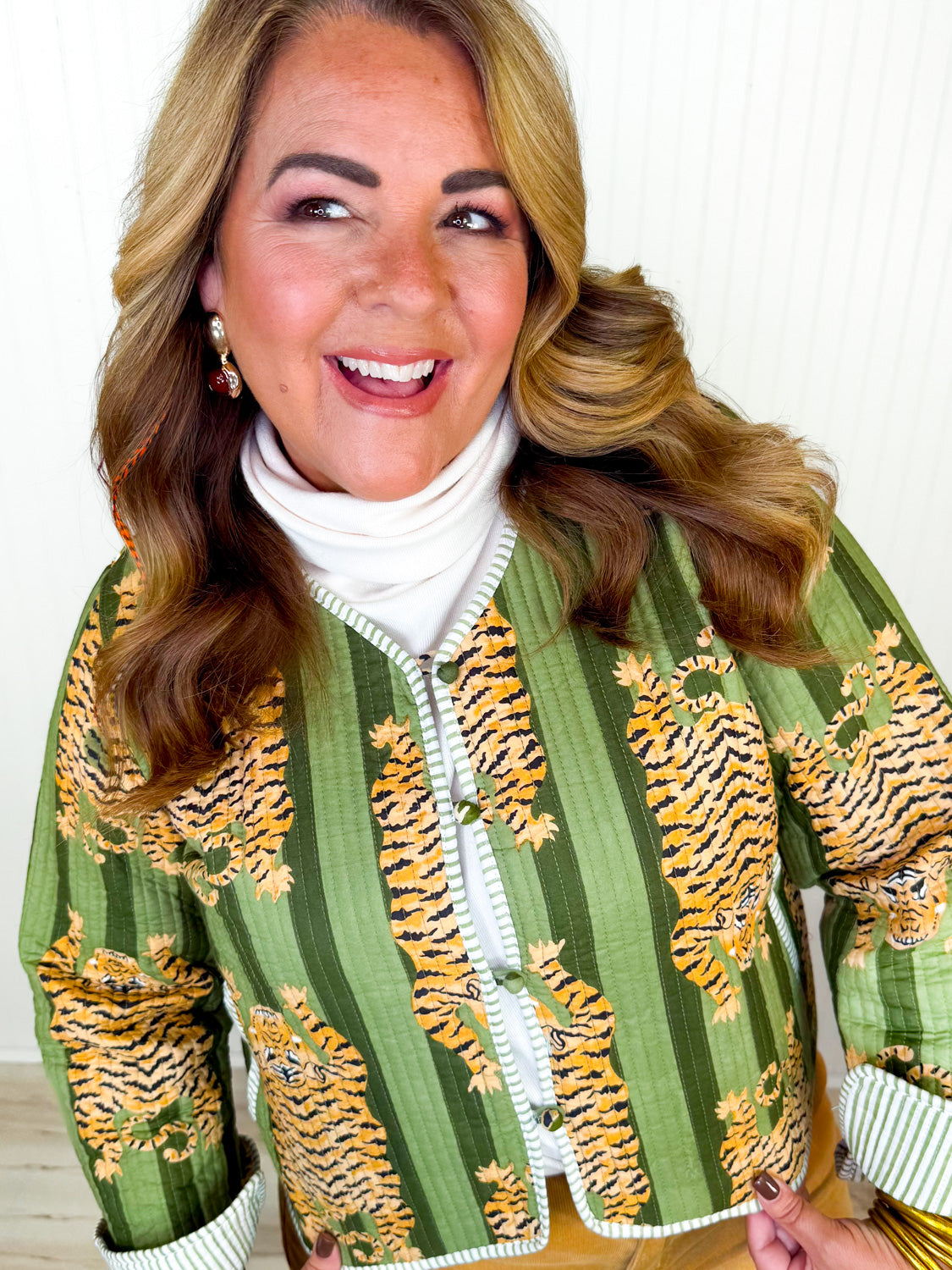 Discover the charm of our Talking Tigers Quilted Jacket, designed for the fashion-forward. Its shorter length brings a modern edge to any outfit, offering both style and functionality. Equipped with a button-down front, this piece promises ease of wearing and versatility in styling. Its pockets are not just practical; they add an element of casual chic to the overall design. Ideal for layering, this jacket introduces a vivid pop of color to brighten the dreary days of winter and spring alike. Whether you're aiming for a sophisticated look for the evening or a casual daytime ensemble, this jacket seamlessly transitions to match your mood. Let the Talking Tigers Quilted Jacket be the dynamic addition your wardrobe craves!