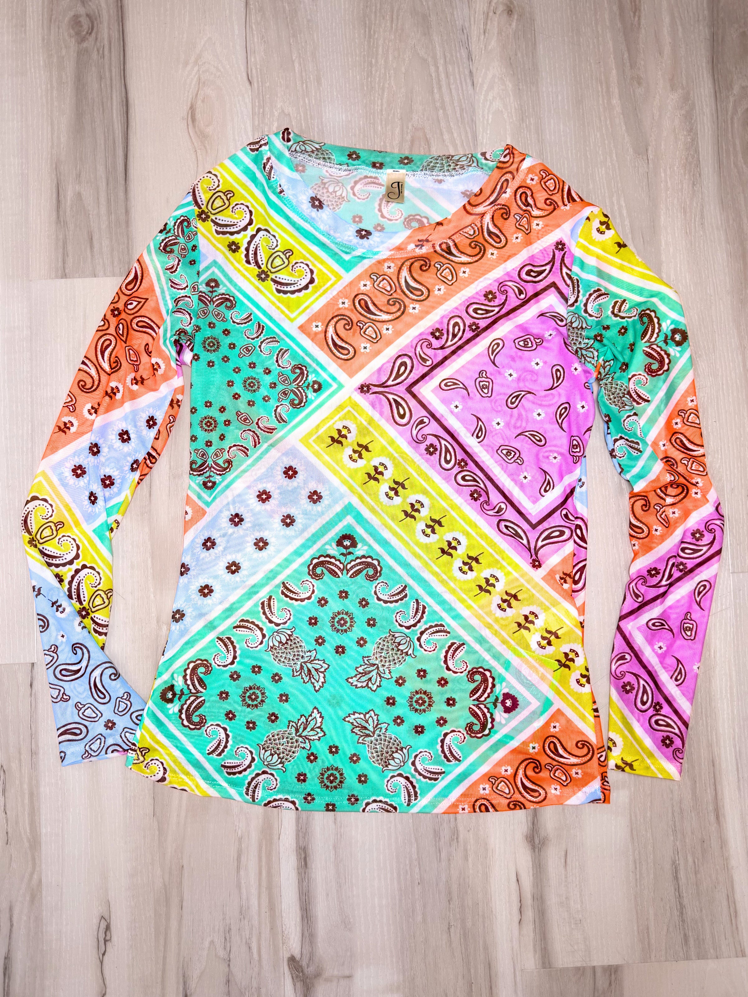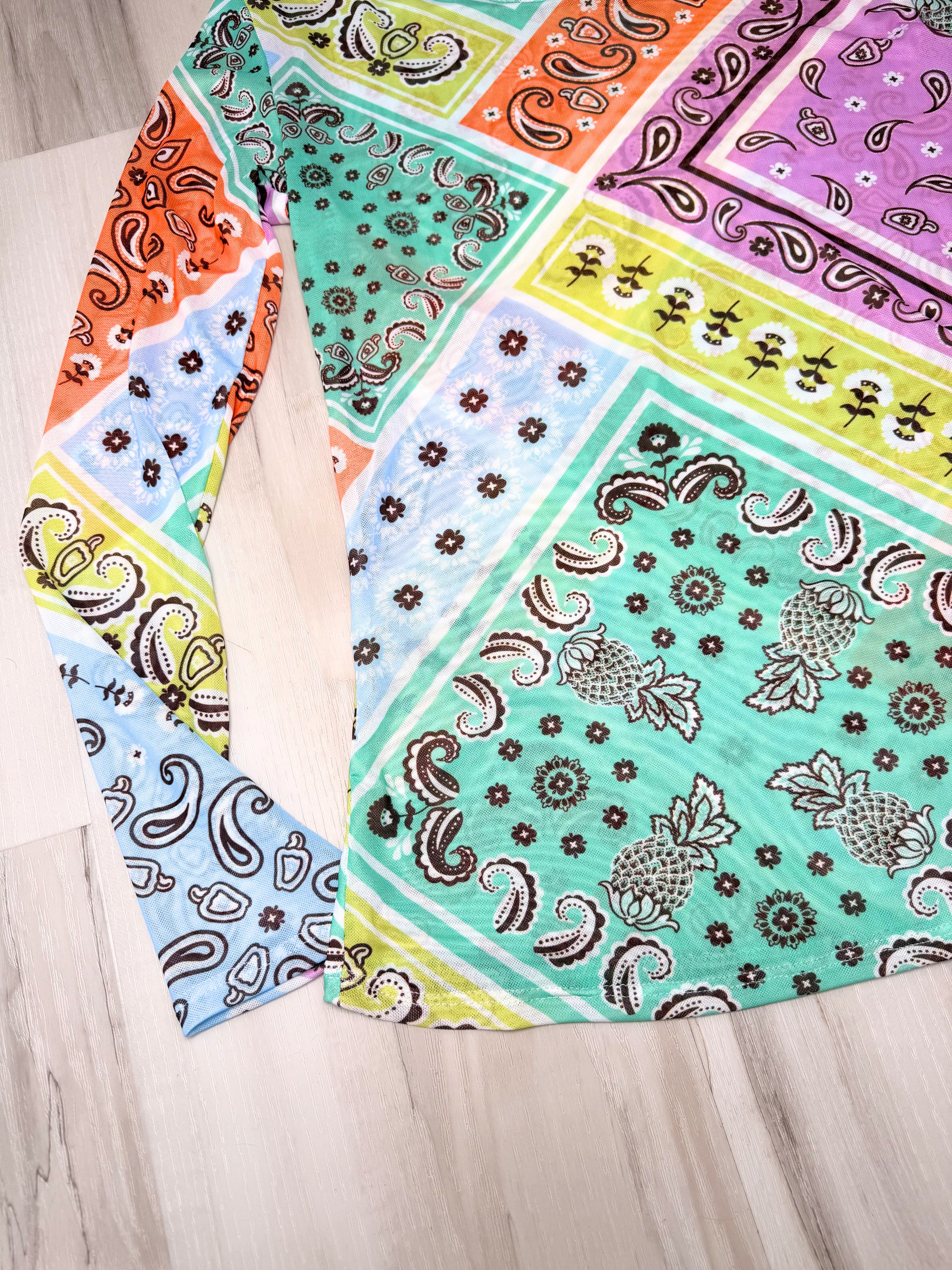 Lightweight, stylish, and perfect for the changing spring weather the Bandana Bonanza Mesh Top is a must-have layering piece for the season. Featuring bandana print in multi colors. Its breathable mesh fabric makes it perfect for cool mornings and warm afternoons, whether worn alone or layered under with your favorite tank or bralette.