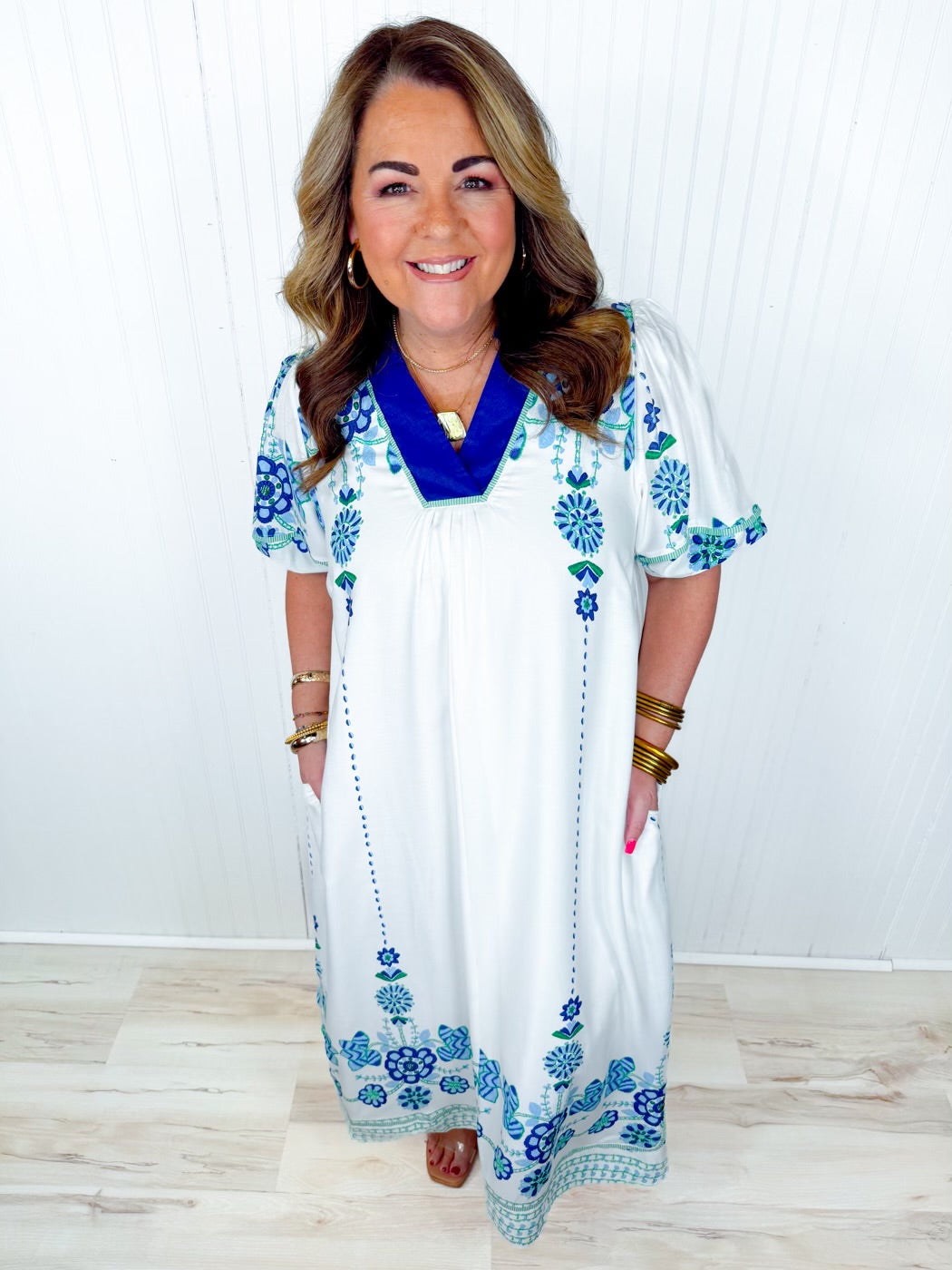 • White dress with blue and green embroidered detail throughout