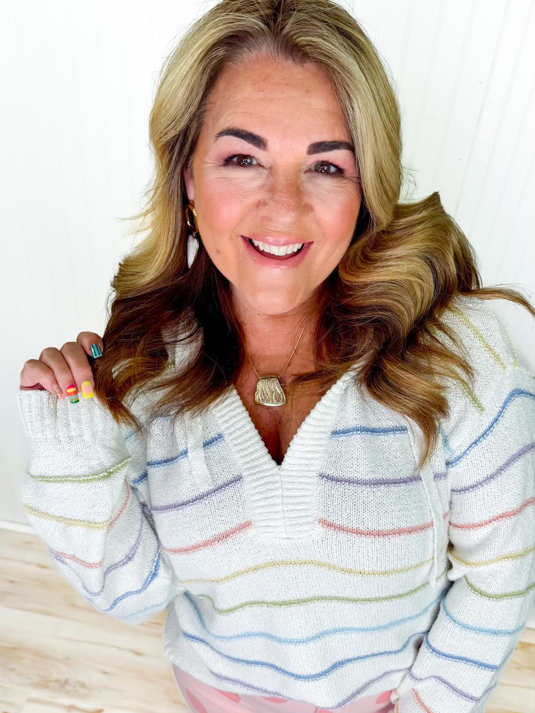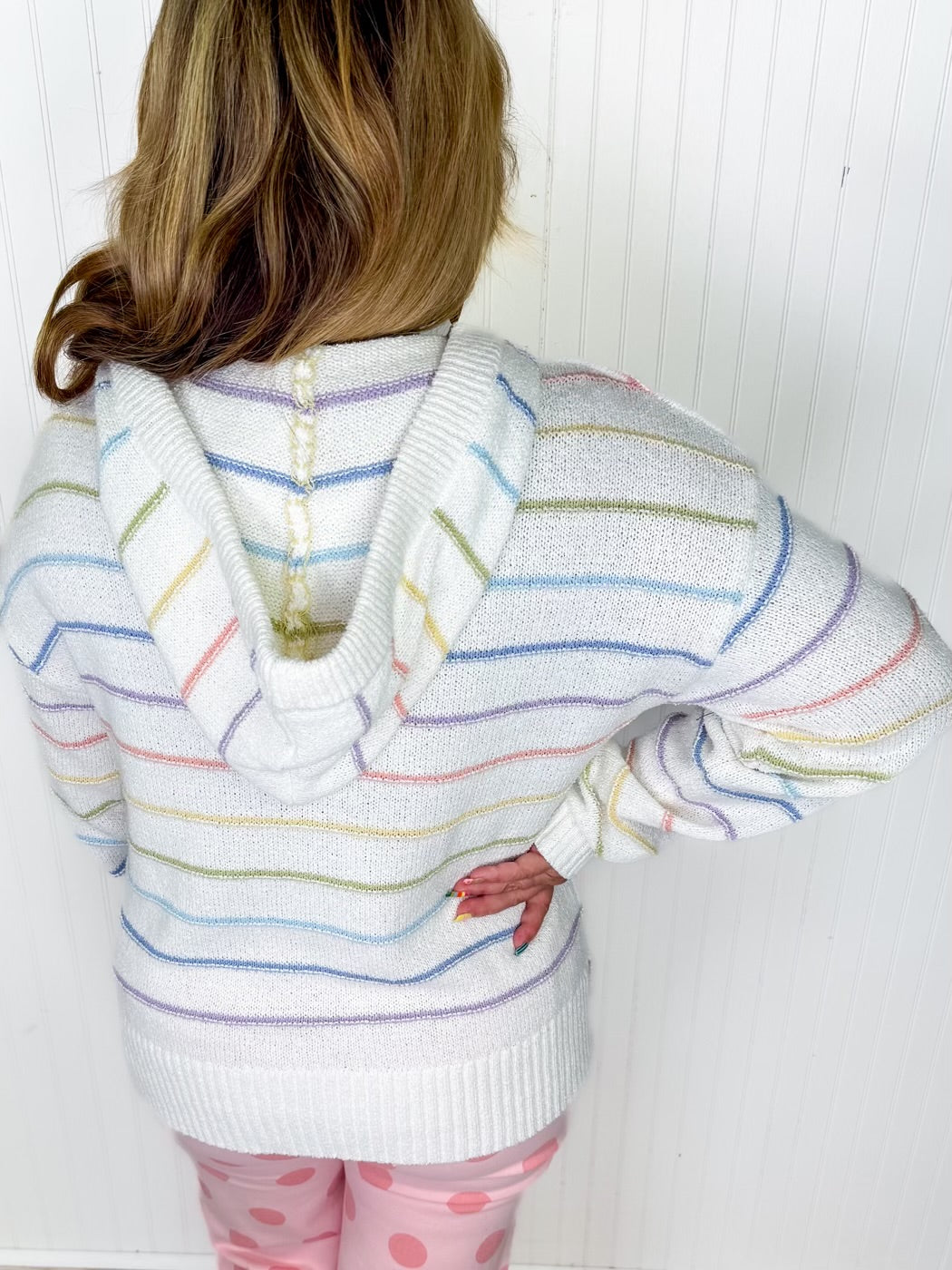 Soft colors and effortless style come together in the Pastel Daydream Top! This lightweight top features a beautiful pastel and cream stripe pattern that’s perfect for the season. Designed with a relaxed hoodie style and flattering v-neckline, it’s an easy piece to throw on for a cute and casual spring look.