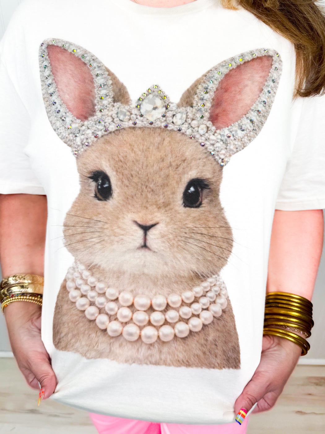 Chic, playful, and full of personality, the Queen Rabbit Tee is a whimsical wardrobe favorite. Featuring a stylish bunny wearing a crown and layered pearl necklaces, this tee adds a touch of boutique charm to any casual look. Soft, comfortable, and easy to wear, it’s perfect for pairing with your favorite jeans, skirts, or leggings.