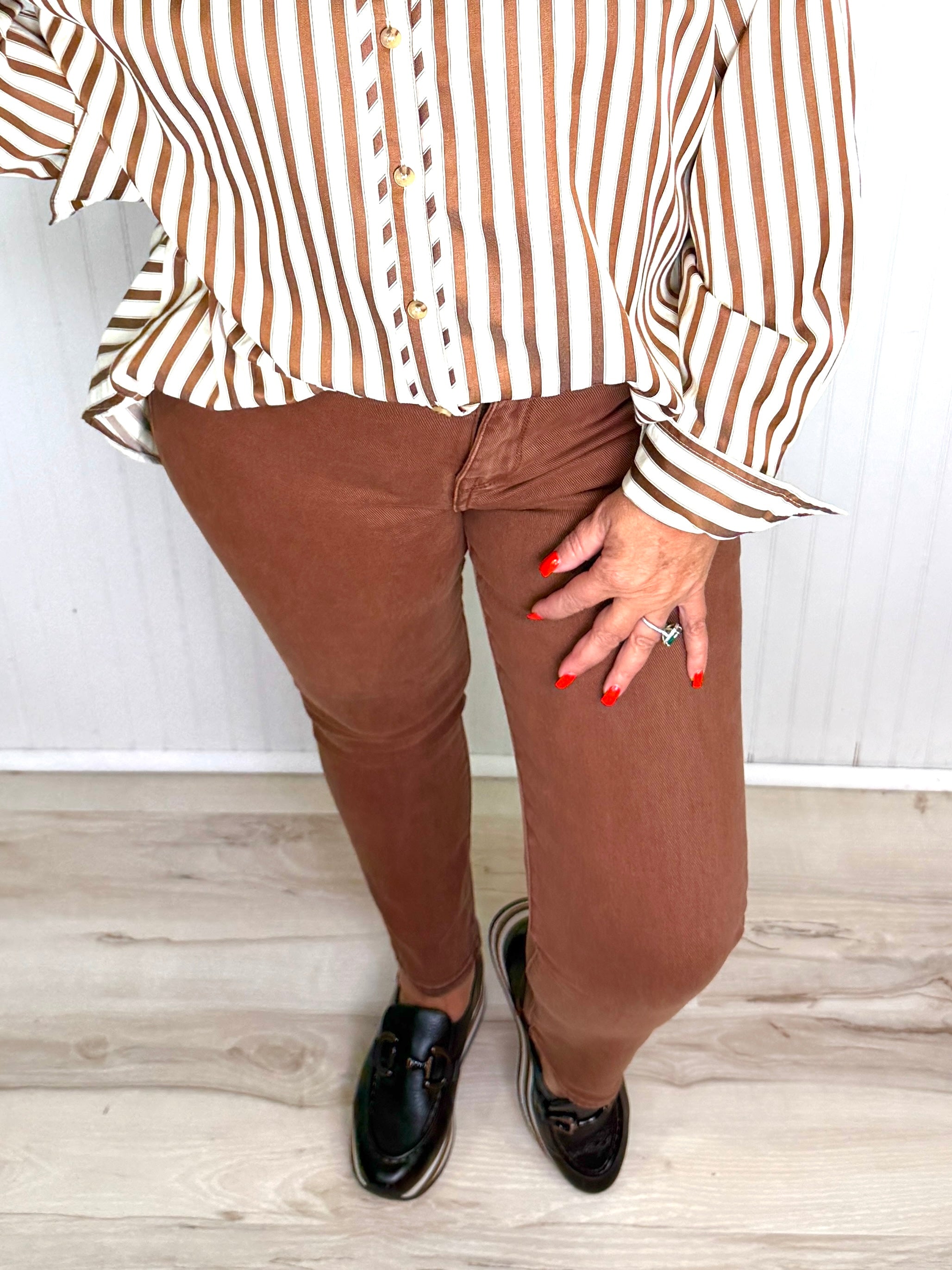 The Chloe High Rise Skinny Jeans by Risen are a versatile addition to your winter wardrobe. These jeans feature a high rise that sits comfortably at the waist and a relaxed fit through the hips for ease of movement. The stretchy fabric provides all-day comfort while maintaining a flattering skinny silhouette. Designed in a staple brown shade, they pair effortlessly with sweaters, jackets, and boots for a polished seasonal look. Durable and stylish, these jeans are perfect for everyday wear or layering for cooler weather. Their clean, modern design makes them a go-to piece for building multiple outfits throughout the winter months!