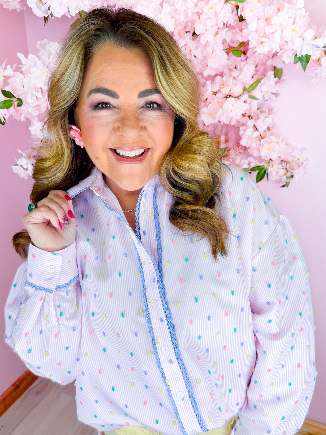 Playful meets polished in the Sugar Dots Button Up – Pink. Crafted from a lightweight blend of 65% polyester and 35% cotton, this charming button-down features soft pink pin-line stripes adorned with multicolored embroidered polka dots for a fun, boutique-worthy twist. The scalloped detailing along the collar adds a feminine finish, elevating this classic silhouette with sweet detail. Perfect for pairing with denim or tailored bottoms, this top effortlessly transitions from everyday wear to standout style. 💗