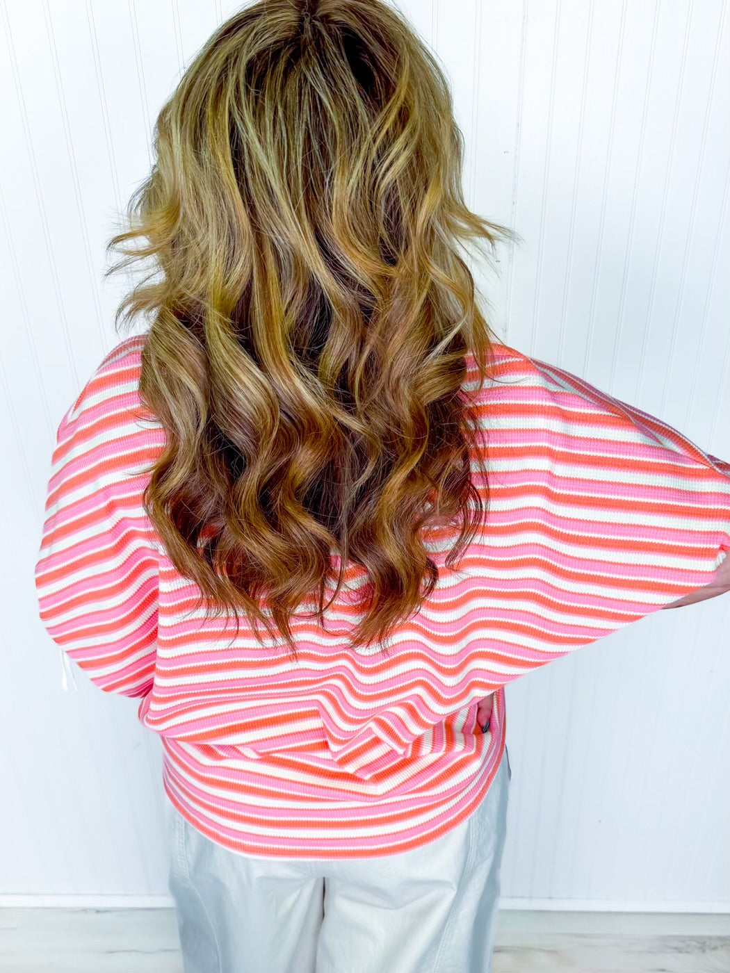 Brighten up your wardrobe with the Sunday In Stripes Top! This fun and vibrant top features cheerful pink, orange, and white stripes that are perfect for adding a pop of color to your day. Designed with a flattering scoop neckline and adjustable sleeve cuffs, it offers both style and comfort for an easy, everyday look.