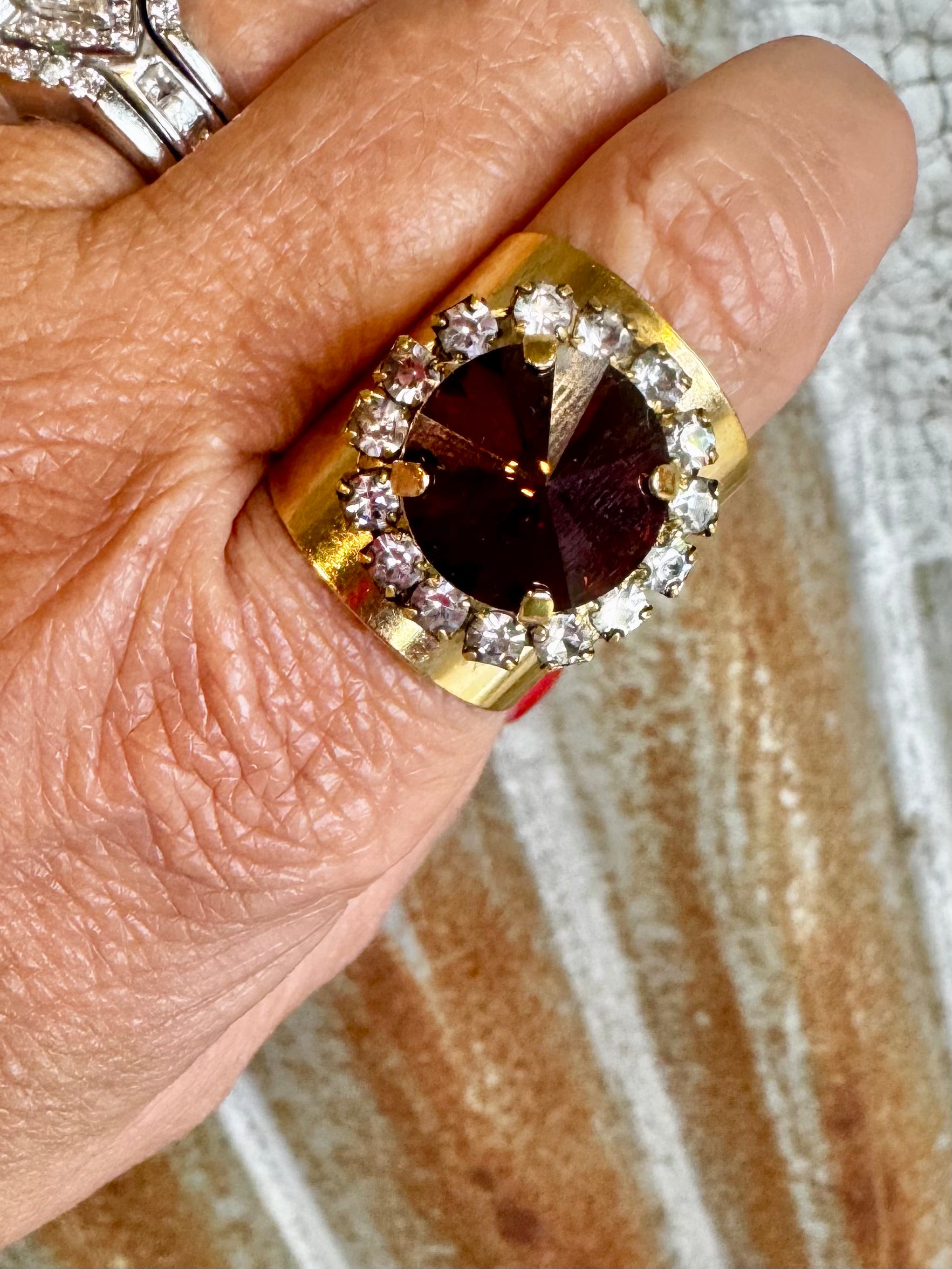 Make a real statement with the Jacci Ring! This bold, adjustable ring is made from Light Gold plated Brass base metal and is covered with twinkling high quality crystals. The 14mm stone adds an extra touch of glamour and sparkle. Whether you're dressing up for a night out or adding a bit of bling for a special occasion, this Made in Canada piece will make you shine.