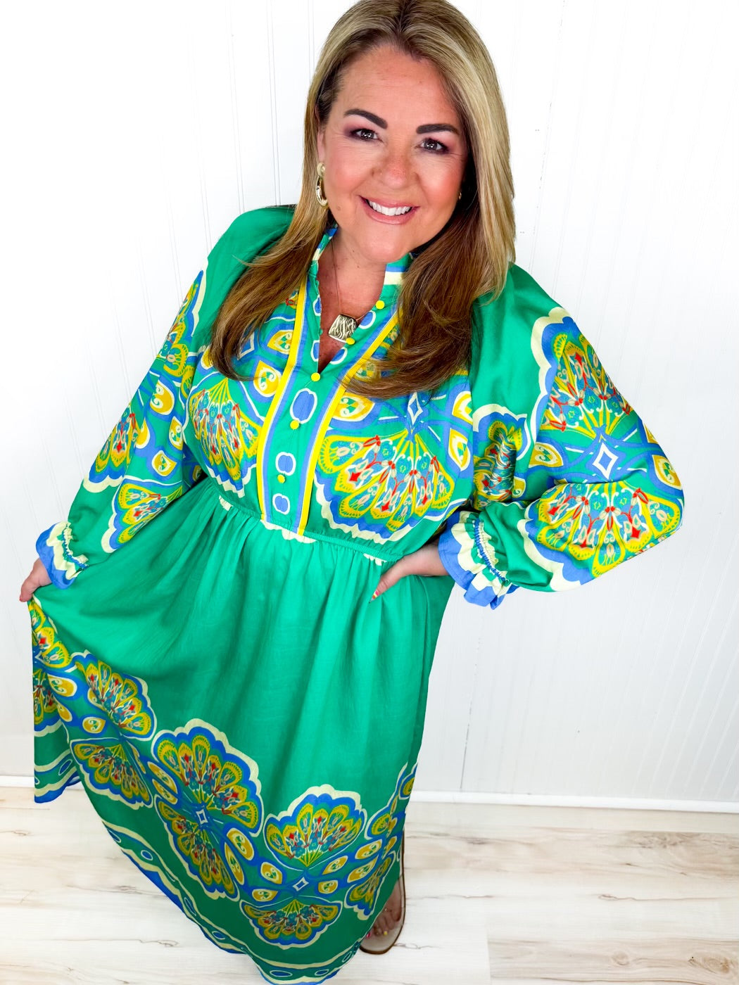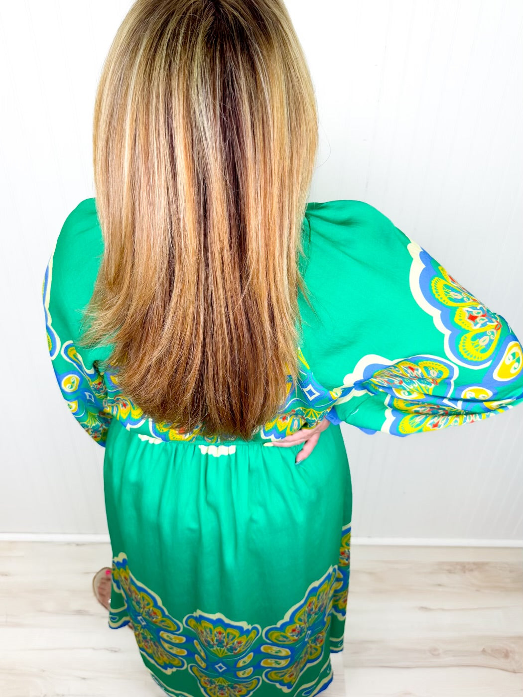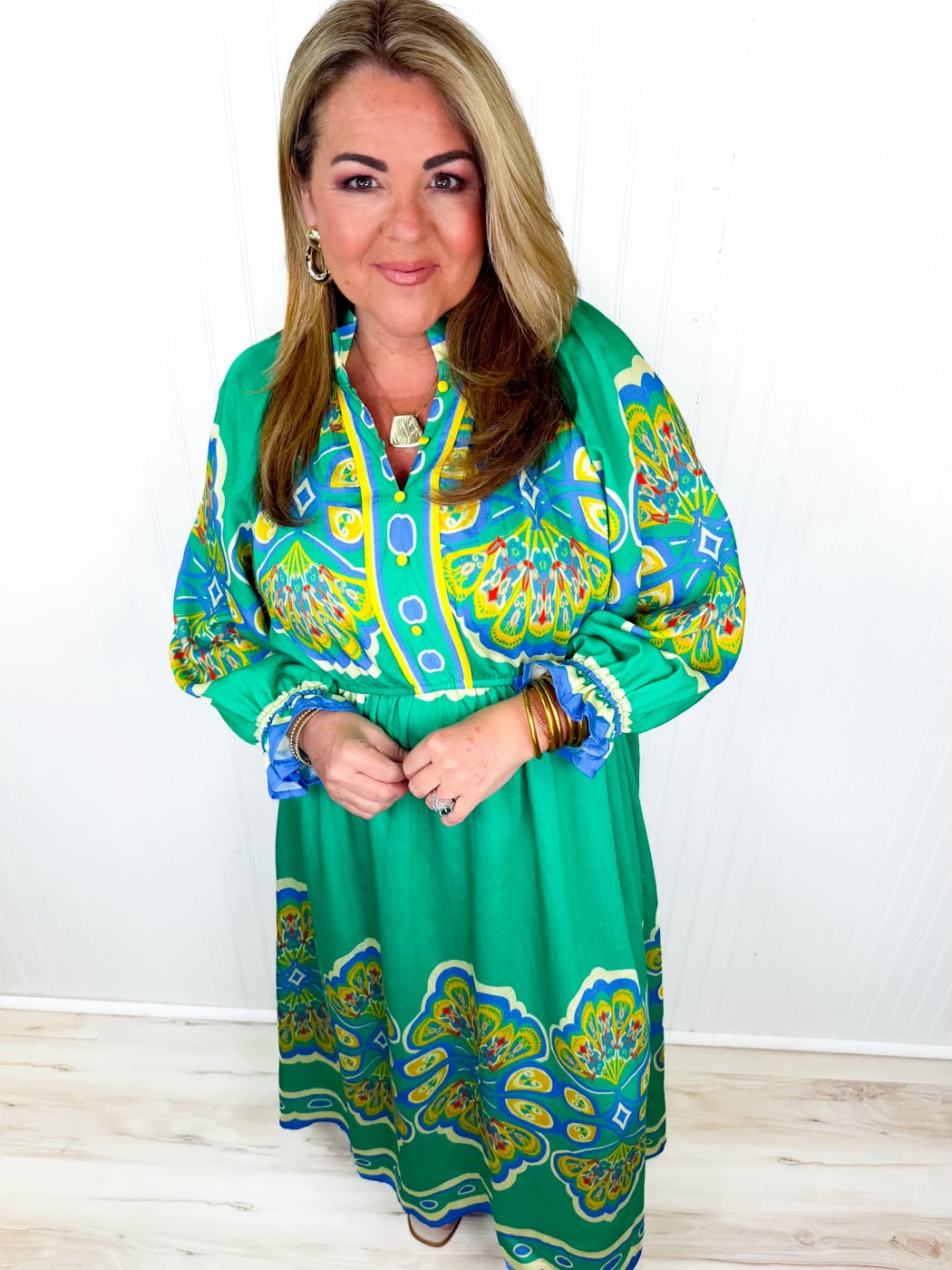 Charming and full of color, the English Garden Dress is a beautiful blend of classic style and playful detail. Featuring a rich emerald green base with a vibrant multicolor medallion print, this dress instantly stands out. The flattering empire waist creates a graceful silhouette, while the long sleeves with delicate ruffle cuffs add a soft, feminine touch. Fully lined for comfort, this dress is perfect for brunch dates, special gatherings, or any moment you want to feel effortlessly elegant.