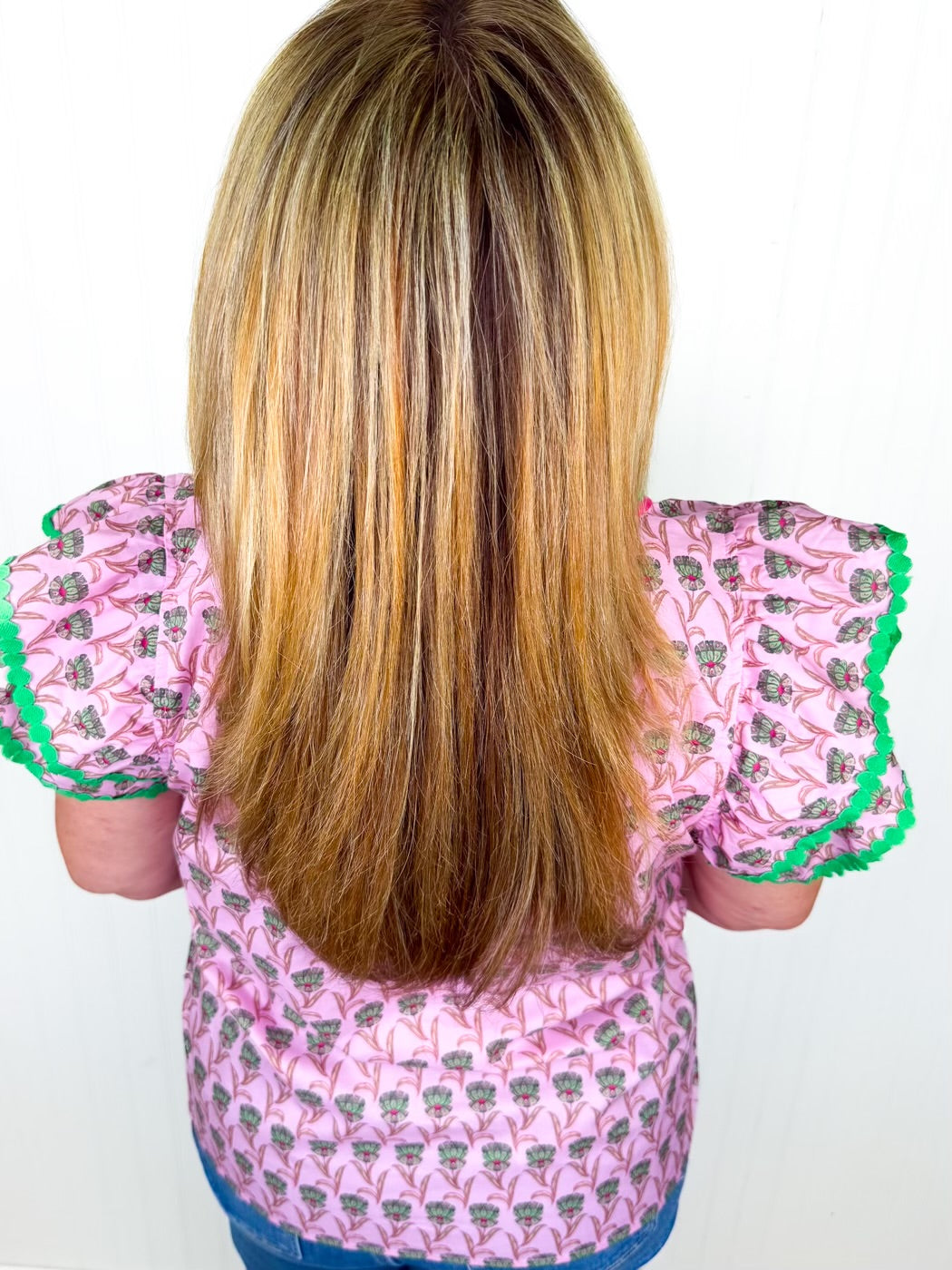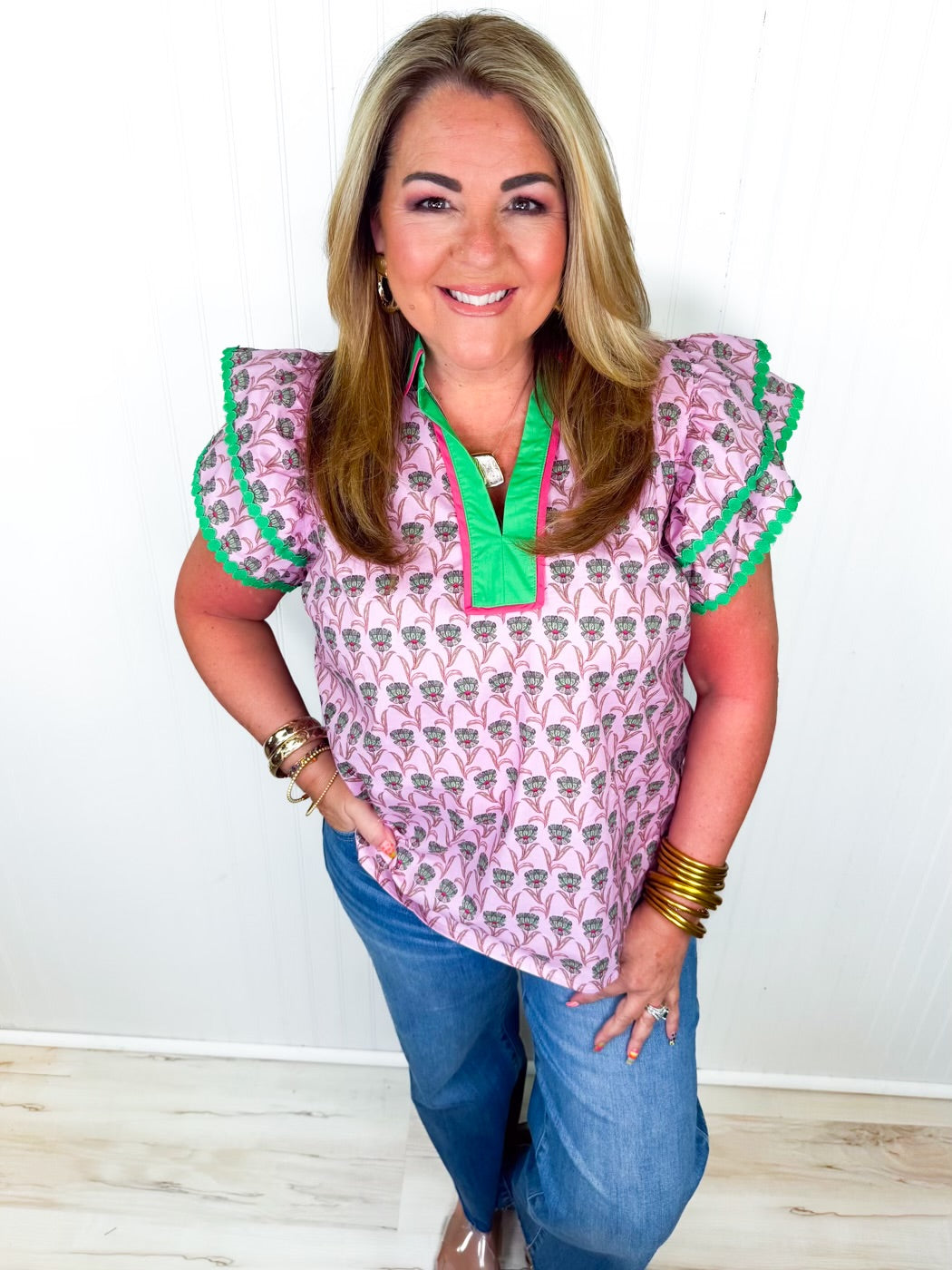 Soft, playful, and full of boutique charm, the Erynn Ruffle Sleeve Top is a must-have for your spring wardrobe. Featuring a light pink background with green and pink contrast detailing on the neckline and collar, this top adds the perfect pop of color to any outfit. The flirty ruffle sleeves and split neckline give it a feminine, airy feel, while the soft cotton fabric ensures all-day comfort. Pair it with jeans, skirts, or shorts for a fresh, polished look.