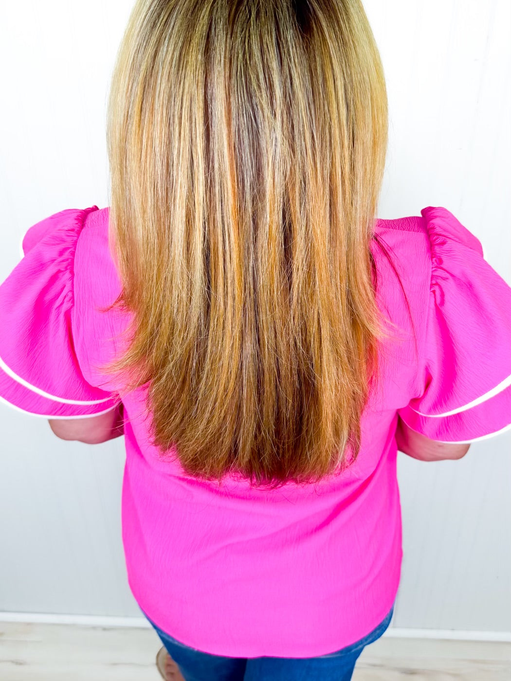 Bright, cheerful, and effortlessly feminine, the Pink & Graceful Top is a boutique favorite for adding a pop of color to any outfit. The vibrant hot pink fabric is accented with crisp white detailing along the neckline, collar, and sleeves, giving it a polished, playful look. Flirty ruffle sleeves and a split neckline add soft, feminine touches, while the lightweight fabric ensures all-day comfort. Pair it with jeans, skirts, or tailored pants for a versatile, stylish ensemble.
