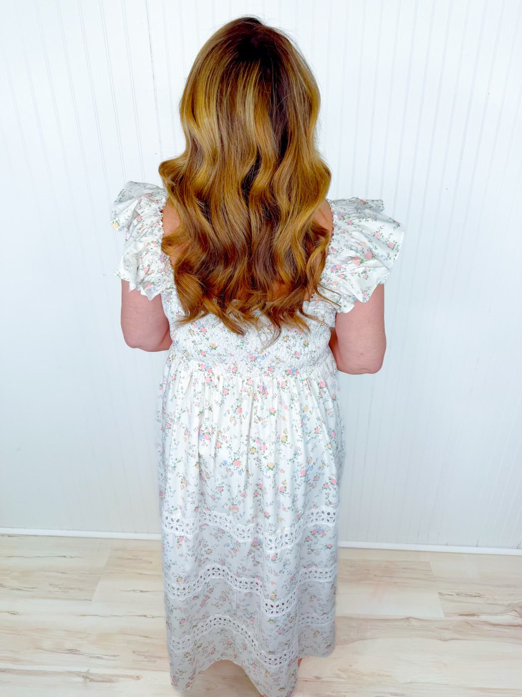 The Southern Grace Dress is a dreamy addition to your spring wardrobe. This ivory smock dress features a soft pastel floral print, creating a light and airy look perfect for warm-weather gatherings. Delicate ruffle sleeves add a playful, romantic touch, while the smocked silhouette offers comfort and a flattering fit for all-day wear.
