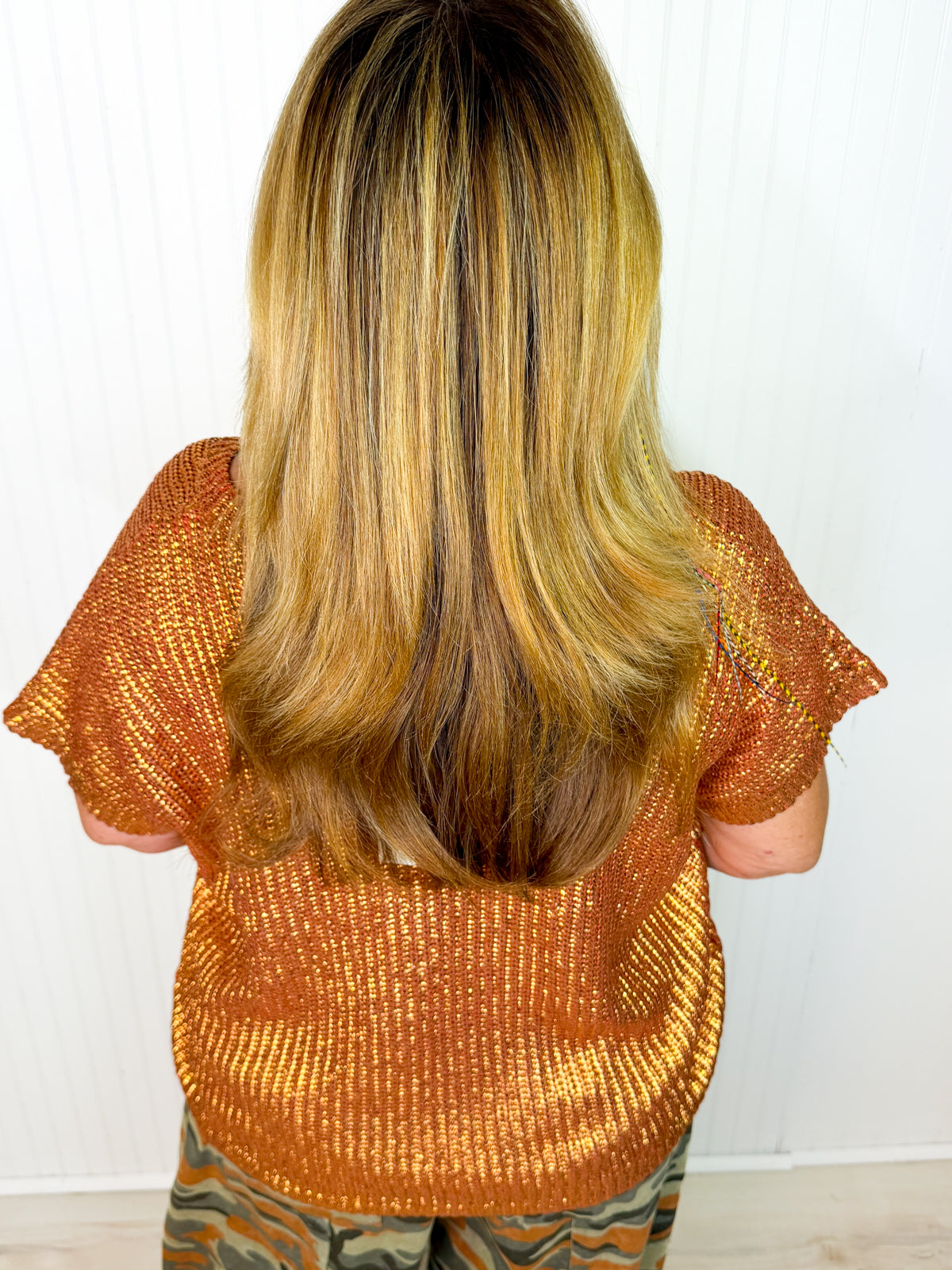 The Desert Flame Metallic Top features a relaxed fit with subtle metallic detail for a touch of shine. This short sleeve sweater includes a convenient front pocket for added style and functionality. Its versatile design allows it to be paired with jeans, joggers, or leggings for casual everyday wear or a relaxed outing. Lightweight and comfortable, it moves easily with you while maintaining a polished look. Perfect for layering or wearing on its own, this top blends effortless style with practicality, making it a staple piece for your wardrobe this season!