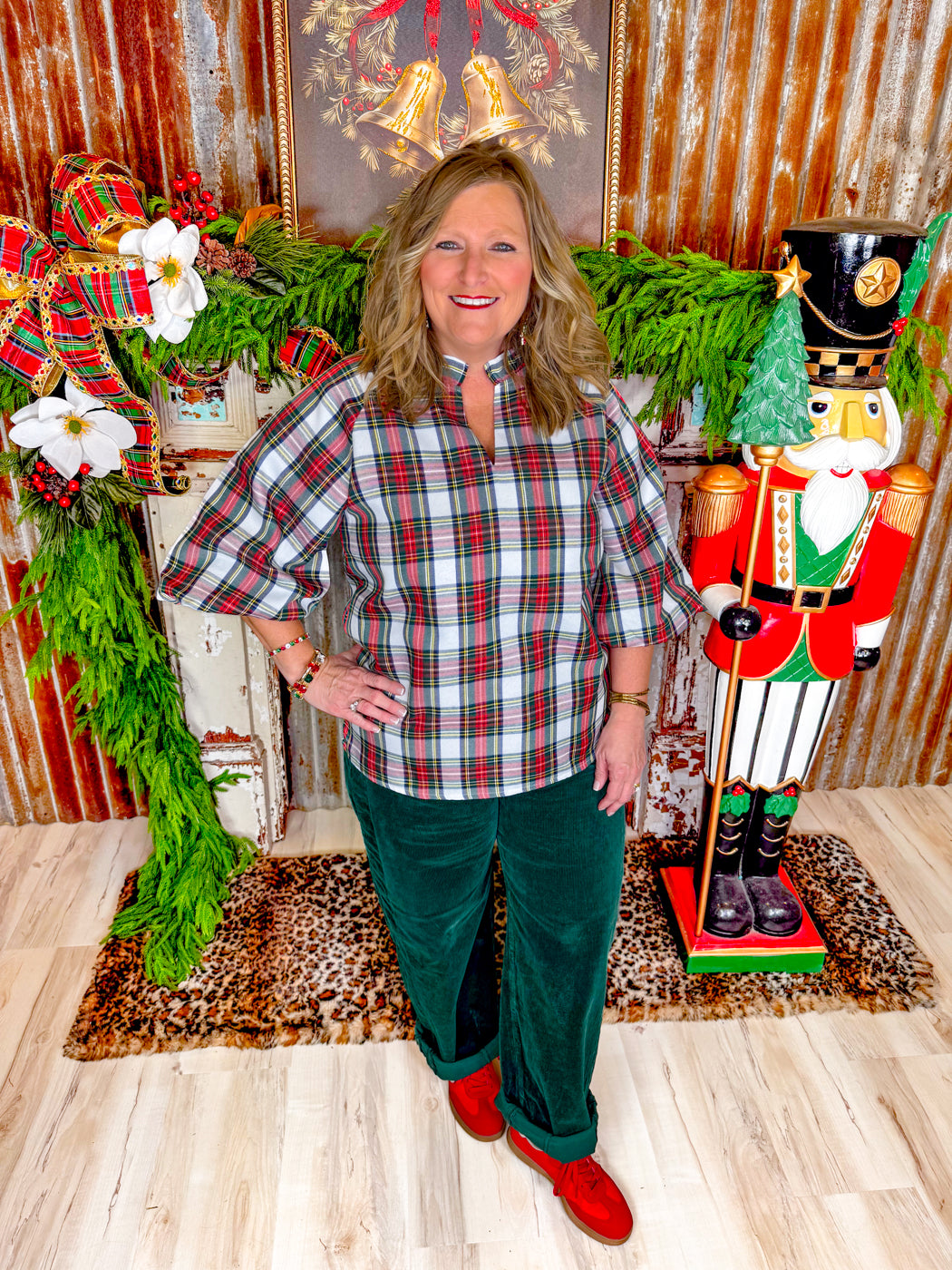 The Christmas Cutie Plaid Top is a relaxed-fit blouse designed for comfort and easy styling. It features a flattering v-neckline and bubble sleeves that add a touch of charm to the classic plaid pattern. Made from 100% polyester, this top is lightweight and breathable, making it perfect for layering or wearing on its own throughout the holiday season. Pair it with jeans for a casual day look or style it with a skirt for a dressier outfit. The Christmas Cutie Plaid Top offers a festive, versatile option for any occasion, combining comfort and seasonal flair in one effortless piece!