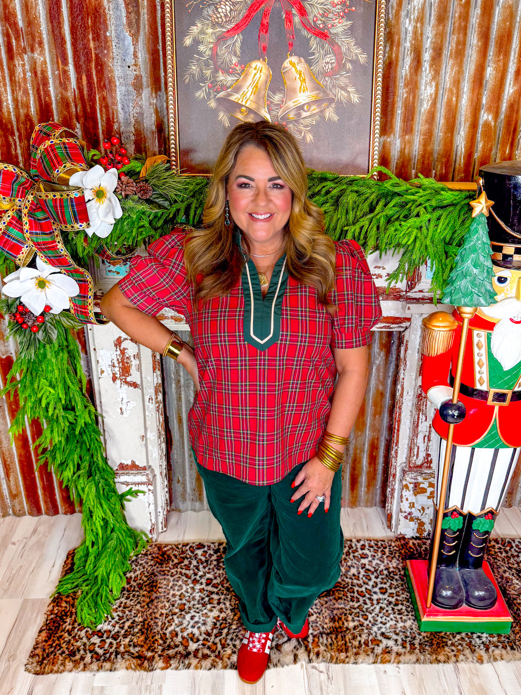 The Holiday Hues Plaid Top is a relaxed-fit blouse designed with a festive plaid pattern that adds a touch of seasonal charm. It features a flattering v-neck with a stand-up collar and stylish bubble sleeves for added shape and comfort. Made from 100% cotton, this top offers a soft and breathable feel that’s easy to wear all day. Perfect for pairing with jeans and simple accessories, it creates an effortless look that’s great for any casual or dressy holiday occasion. Whether you’re heading to a holiday party or spending time with family, the Holiday Hues Plaid Top is a comfortable and polished choice for the season!