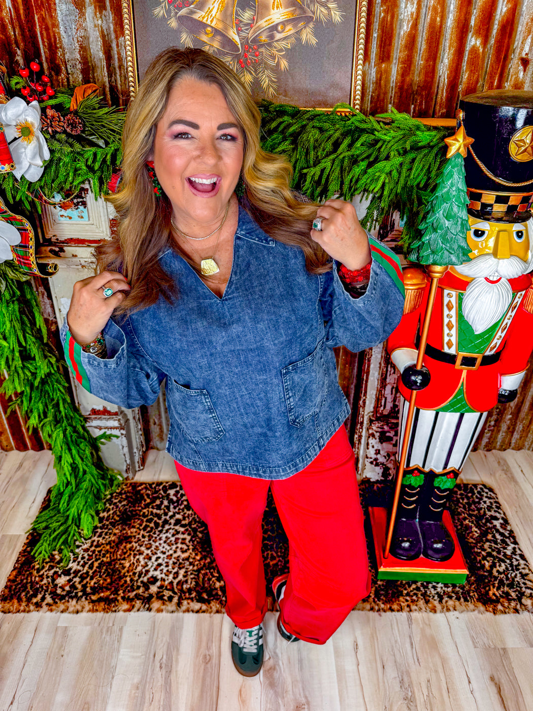 Your new go-to denim favorite gets a cheerful holiday twist. This pullover features a classic collar with a relaxed V-neck and functional front pockets for an effortless, laid-back look. Down each sleeve runs a bold green-and-red stripe detail, adding the perfect pop of festive color without being over the top.