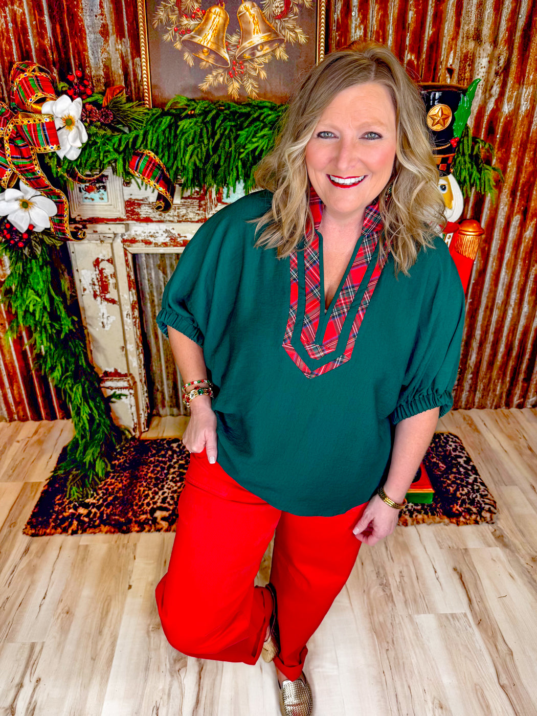 The Jingle and Mingle Top is a relaxed-fit blouse designed for effortless holiday style. It features a v-neckline with a stand-up collar that adds a touch of structure and charm. The plaid trim detail gives it a festive look that’s perfect for the season. This top pairs beautifully with jeans for a casual outfit or with pleather leggings for a dressier holiday look. Comfortable and stylish, it’s ideal for family gatherings, holiday parties, or any festive occasion. The Jingle and Mingle Top offers a versatile option for your winter wardrobe, combining ease of wear with classic seasonal details that make it a standout choice for celebrating in comfort and style!