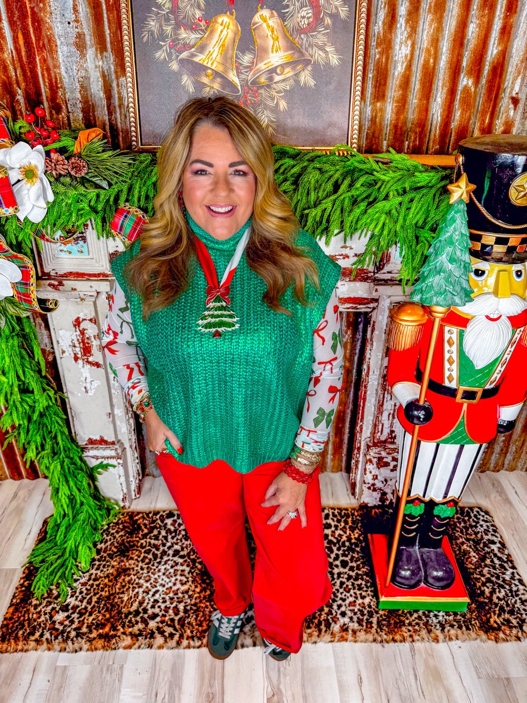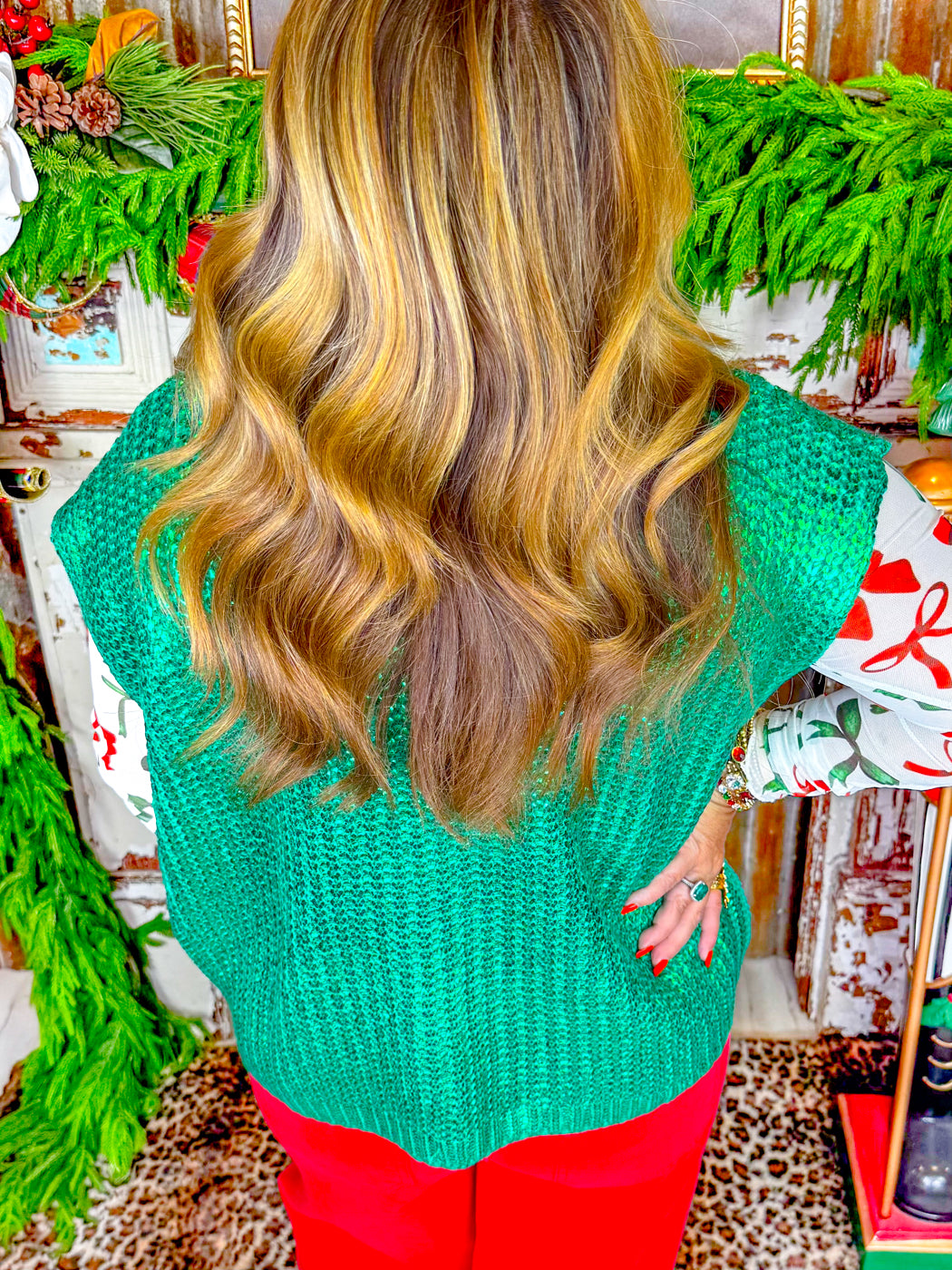 The Sleigh All Day Metallic Sweater Top features a mock neck and sleeveless design, making it a versatile addition to any wardrobe. Its gorgeous bright green metallic material adds a subtle shine, while the lightweight and breathable fabric ensures all-day comfort. This top is perfect for layering over a mesh layering top or long sleeves, allowing for multiple styling options. Pair it with jeans for a casual look or dress it up with skirts or tailored pants. The relaxed fit and sleek design make it easy to move in while maintaining a polished appearance. Ideal for both day and evening wear, the Sleigh All Day Metallic Sweater Top combines style and comfort in a single piece, making it a must-have for seasonal layering and transitional outfits!
