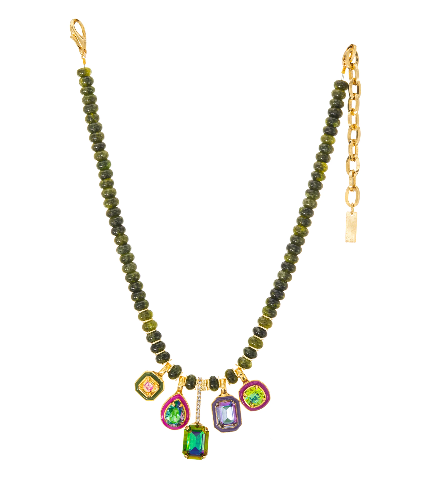 Liven up your look with the Suzanne Necklace! This sparkly stunner will have you turning heads, featuring high quality crystals, hand painted enamel, beautiful beads and an antique gold-plated brass base metal made with love in Canada. Whether you're clinching a big deal or just looking to impress, this beauty's 14" chain and 3.5" extension will do the trick. Oh la la!