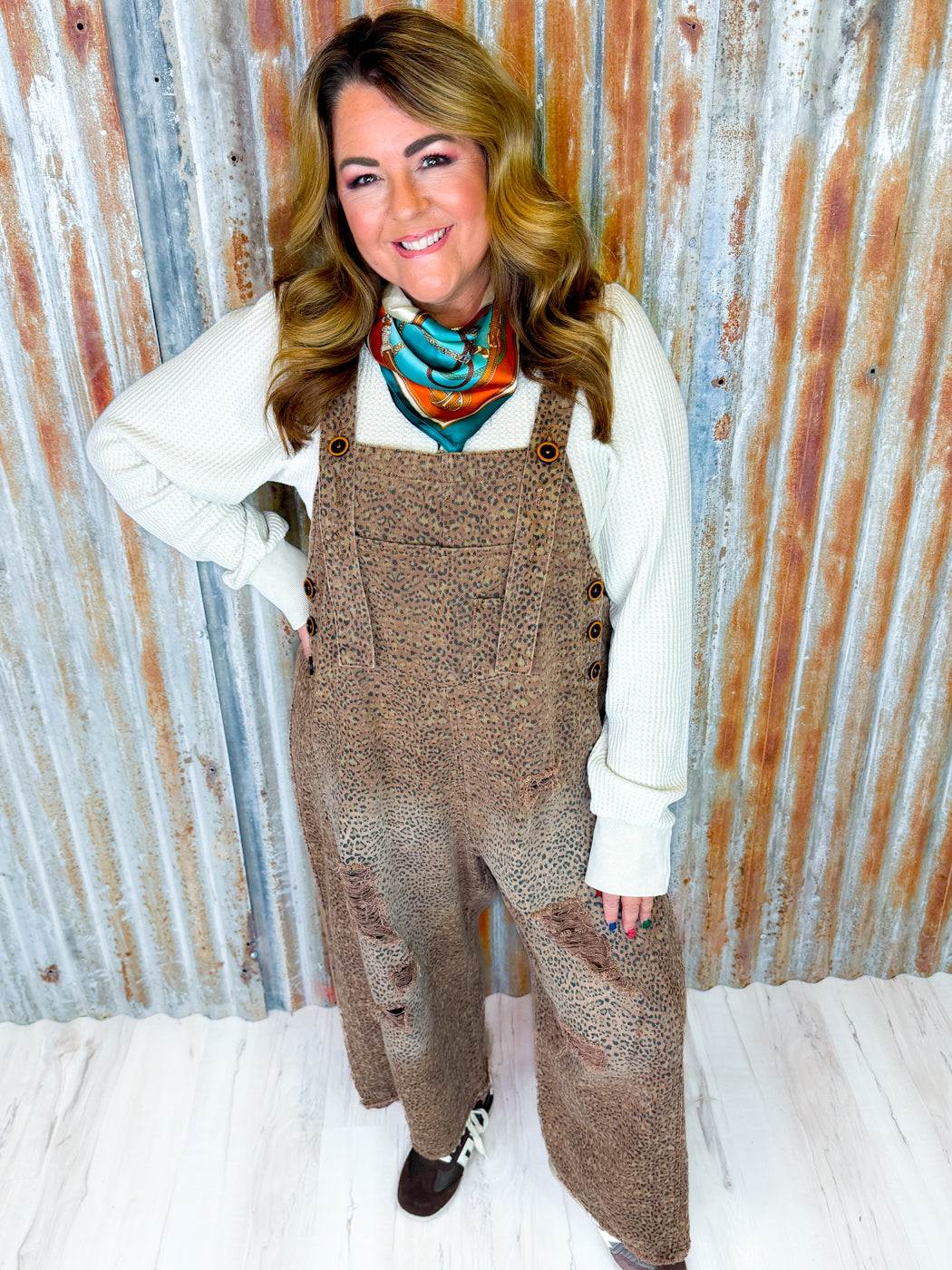The Desert Leopard Overall Jumpsuit features an oversized fit with an easy, relaxed feel. This overall-style jumpsuit includes adjustable straps for a customized fit and slight distressing for added detail. Made from 100 percent cotton, it offers a soft and breathable wear that works for all-day comfort. The leopard print adds a bold touch while keeping the look versatile for many occasions. Layer a long sleeve top underneath for extra coverage or style it with different textures and colors to suit the season. Pair it with booties to elevate the outfit or keep it casual with your favorite flats or sneakers. This piece is designed for effortless styling and can be dressed up or down to match your day!