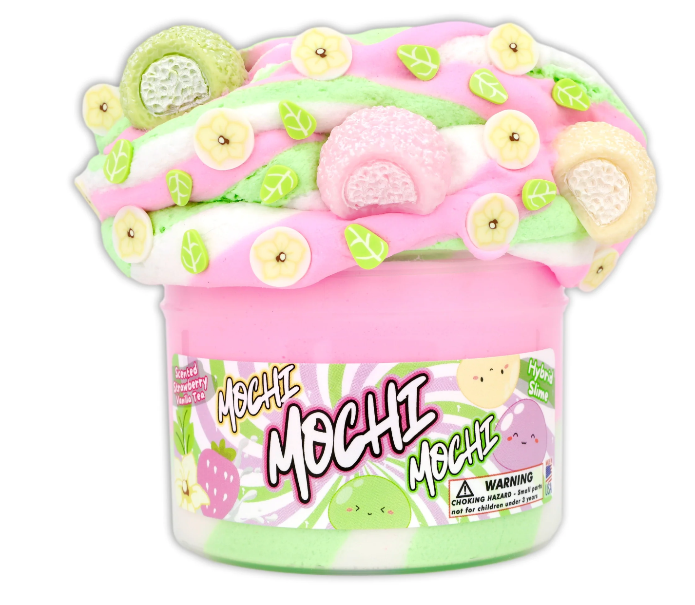 Get ready to satisfy your slime cravings with our Mochi Mochi Mochi! This unique mochi themed hybrid slime features a green and white ice-cream layered base and a super soft pink butter slime topping. Complete with adorable mochi themed charms and fimo, this scented slime smells like strawberry vanilla tea mochi!