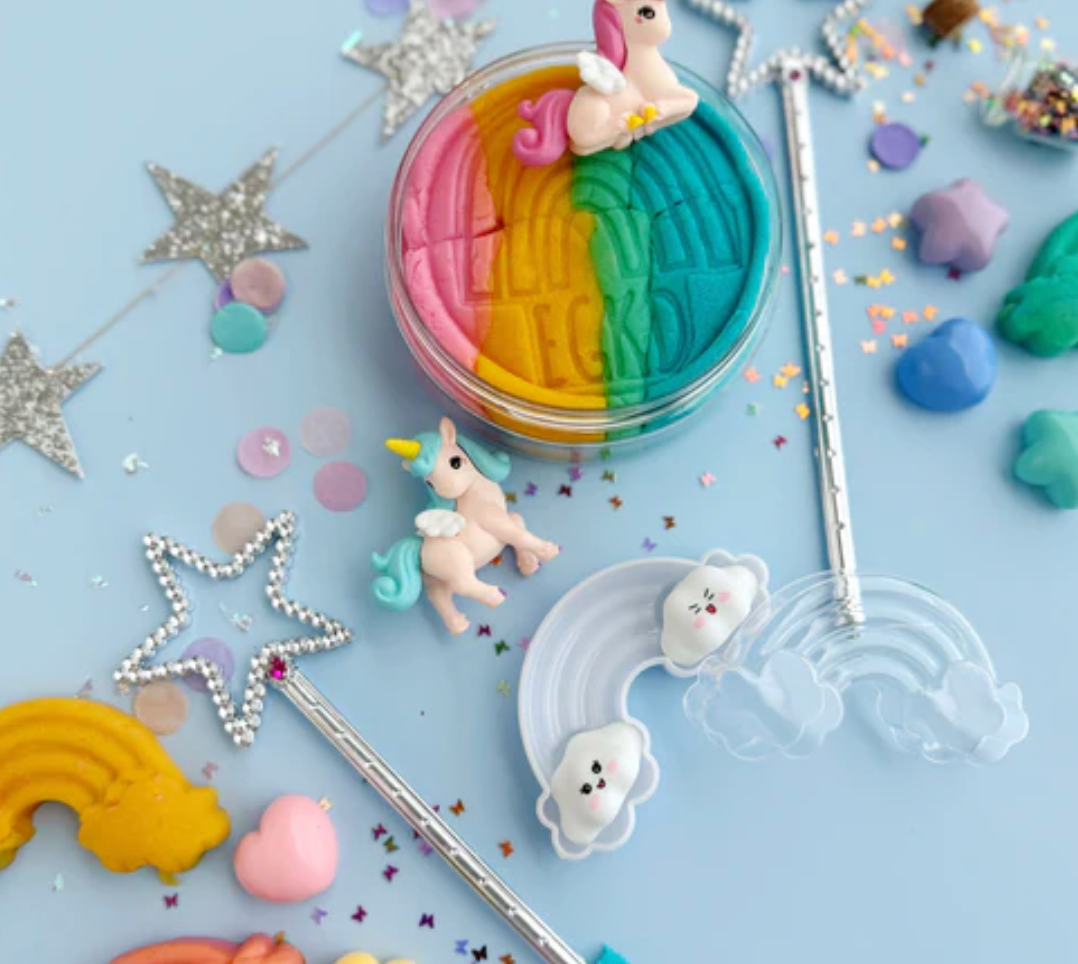 Includes: 8 oz Four Layered "Rainbow in a Jar" (Rainbow sherbet) KidDough, 2 Unicorn Figurines, Rainbow Form, Cloud Form, Smiling Cloud Charms, Pastel Star Charms, Jar of Butterfly Glitter and a 5" Magical Star Wand