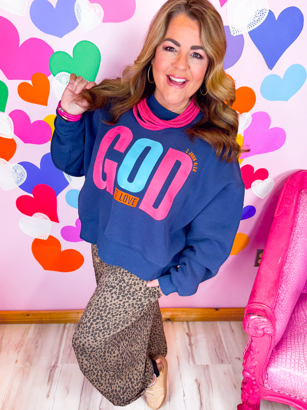 Share a powerful message in cozy style with the God Is Love Sweatshirt. Designed in a rich navy blue with bright, eye-catching lettering, this sweatshirt blends faith and fashion with a soft, comfy feel you’ll reach for again and again.