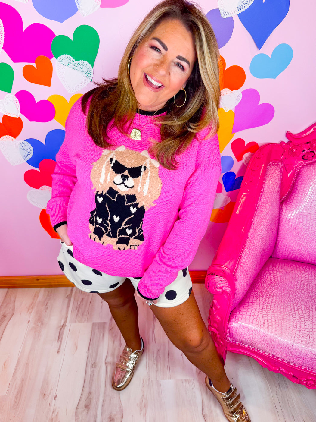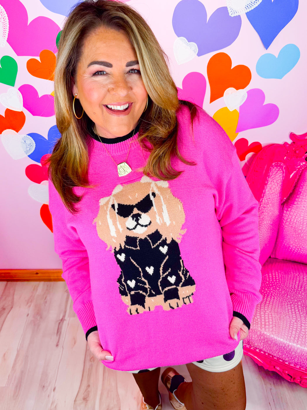 Cute, cozy, and full of personality—the Pawsitively Cool Sweater is a must-have for dog lovers and fashion lovers alike. This super soft pink sweater features black contrast on the collar and ribbed cuffs, plus an adorable dog graphic rocking bows, sunglasses, and a black sweatshirt with heart details. Fun and comfy, it’s guaranteed to make you smile.
