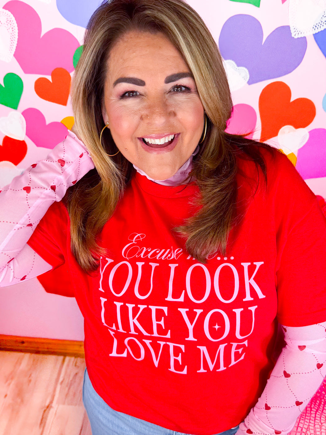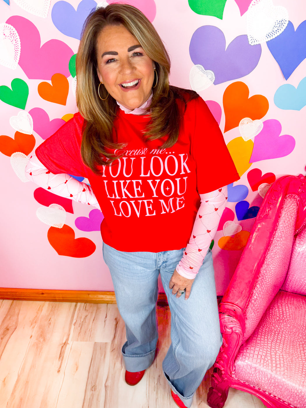 Turn heads this Valentine’s Day with our Excuse Me, You Look Like You Love Me t-shirt. Featuring playful pink lettering printed on a bold red tee, this graphic brings all the flirty charm with a comfy, everyday fit. Perfect for date night, Galentine’s, or styling with denim for a cute casual look.