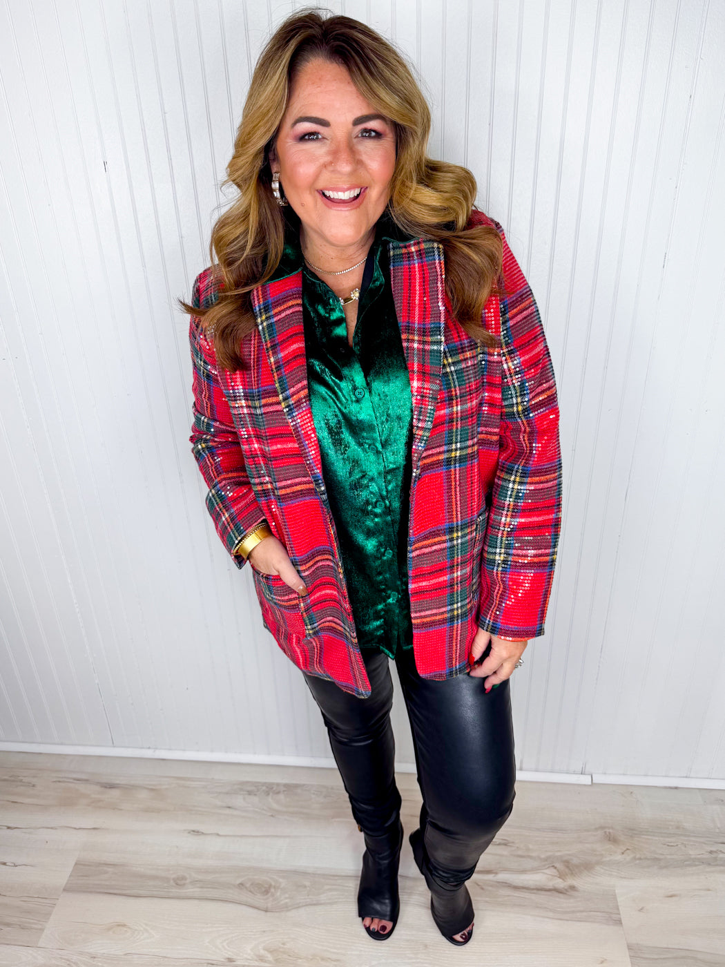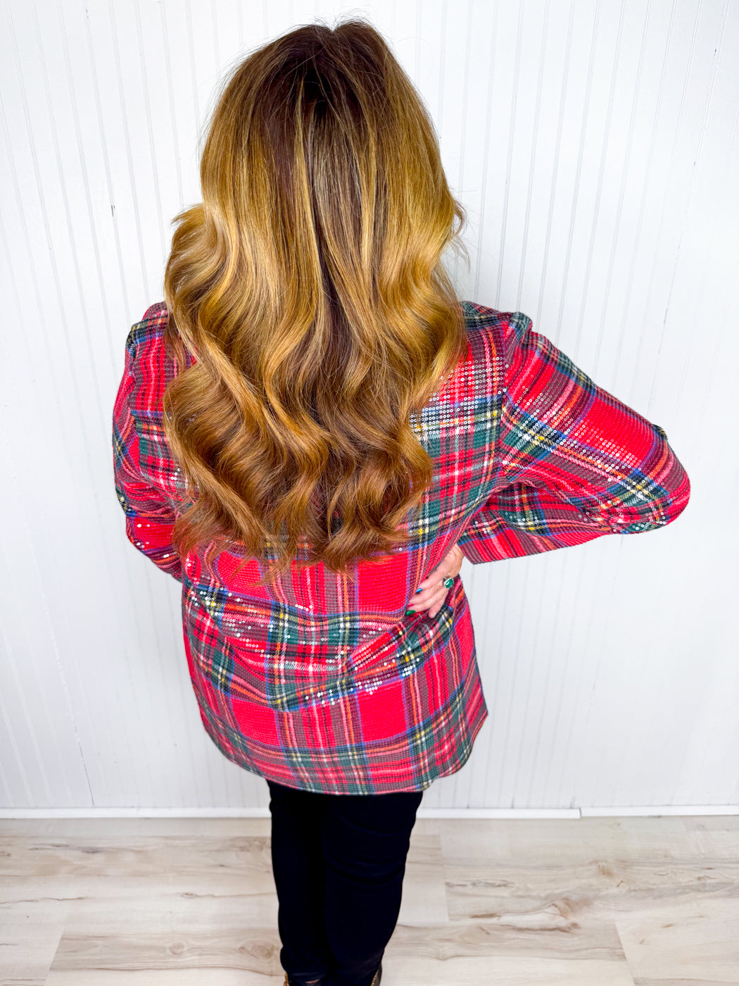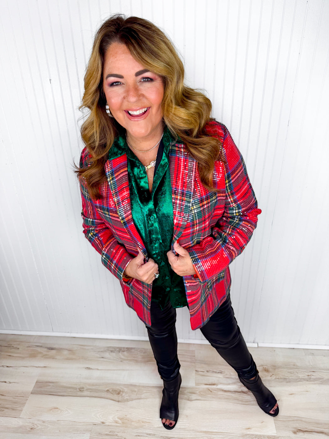 The Season's Sparkle Sequin Jacket is a full-sequined, 100% polyester jacket designed for a relaxed and comfortable fit. It features a button closure and front pockets, making it both stylish and functional. This jacket is perfect for layering over your favorite tops or dresses for winter occasions. Its versatile design allows it to be worn for holiday parties, nights out, or any event where you want a polished and festive look. The relaxed fit ensures ease of movement while maintaining a chic appearance. Pair it with pants, skirts, or dresses to elevate your outfit and add a touch of shine to your seasonal wardrobe!