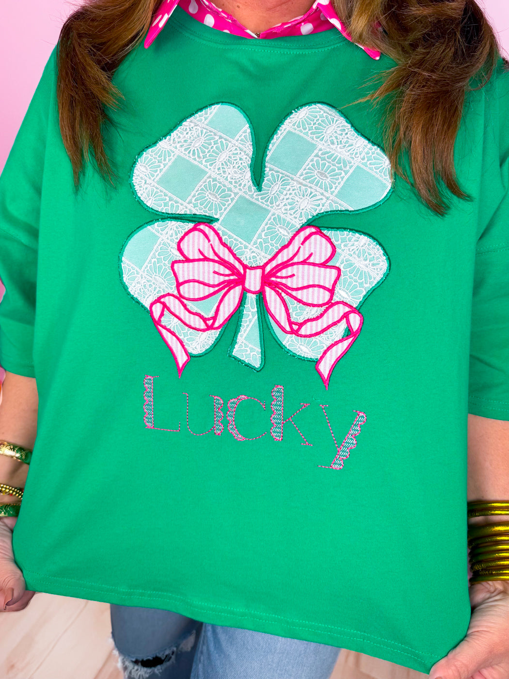 The Shamrock Sweetheart Tee brings the perfect mix of playful charm and festive flair. Made from 100% cotton, this cropped tee features a beautifully detailed lace shamrock accented with a sweet pink bow and embroidered “Lucky” lettering for a feminine touch. Designed with a relaxed fit, it’s comfy, cute, and perfect for celebrating in style—whether you’re dressing it up or keeping it casual.