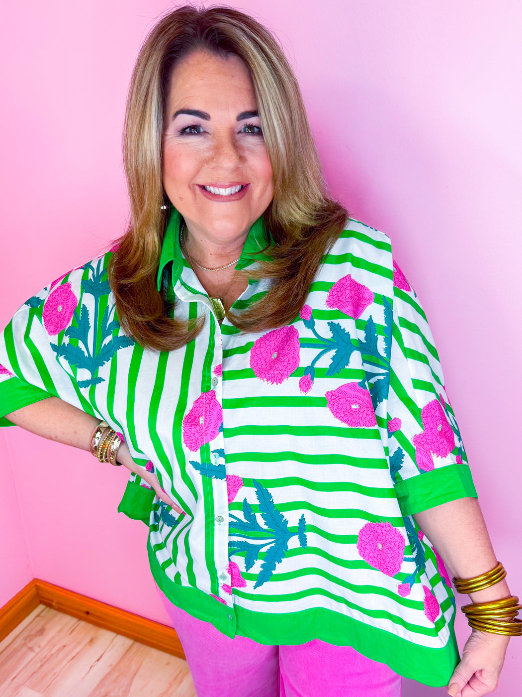 The Savannah Bloom Top puts a feminine spin on a timeless button-down. Made from 100% cotton, this green striped top features soft pink floral detailing for a fresh, charming look. Designed with an oversized, relaxed fit, it’s lightweight, breathable, and perfect for effortless everyday styling. Wear it buttoned up, half-tucked, or layered for an easy chic vibe.