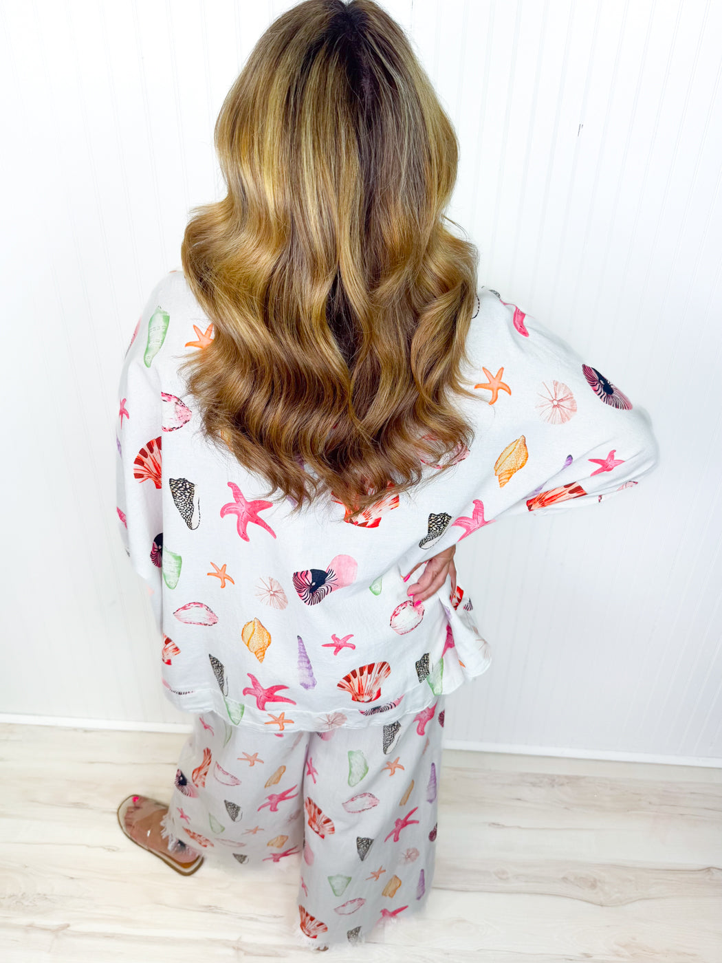 The Seashell Serenade Pants Set is your dreamy go-to for laid-back days with a playful seaside twist. Featuring a natural cream base with charming seashell and starfish prints, this set is full of beachy personality. The oversized button-down top with a classic collar pairs perfectly with the flowy, elastic-waist pants for an easy, breezy fit. Finished with the sweetest scalloped hems and cuffs, every detail adds to its relaxed yet polished vibe.