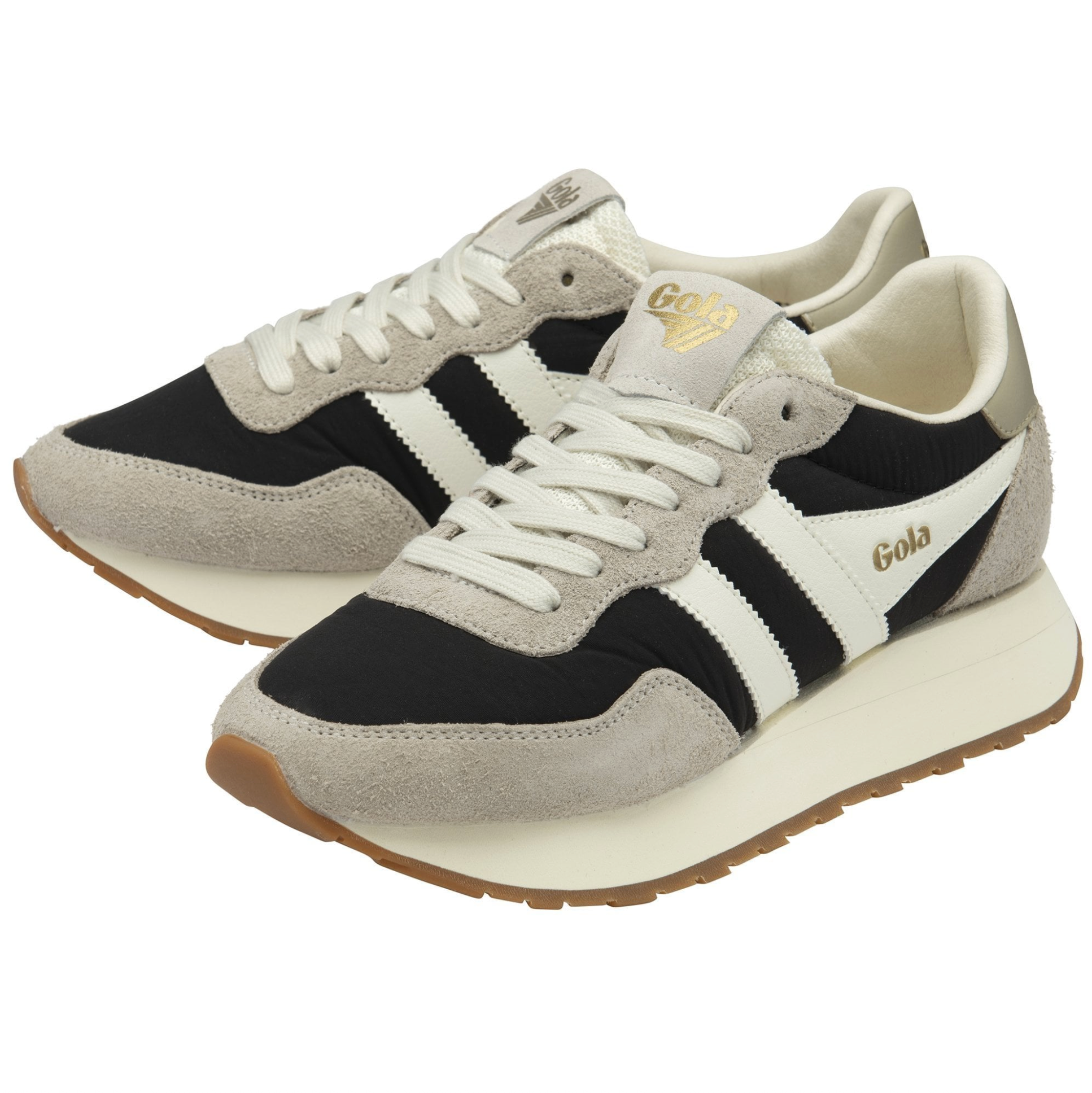 Arizona in black with feather grey is an effortlessly chic and versatile women’s sneaker from Gola Classics. This women's jogger inspired sneaker combines a mix of vintage effect nylon with suede panelling and features an oversized sole. A super comfy in-sock has been incorporated for enhanced comfort meaning these beauties look great and feel great on. Arizona pairs perfectly with a smart casual look.