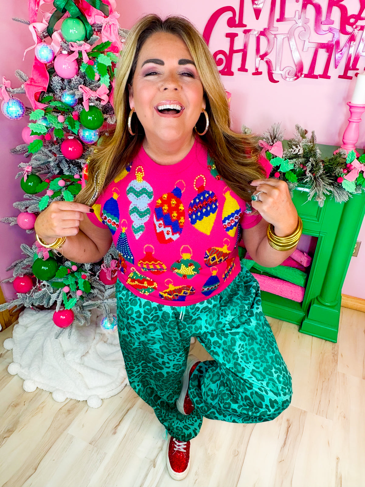 The Pink Jeweled Ornament Top features a relaxed fit and stretchy fabric for comfortable all-day wear. Jewel details add a festive touch, making it perfect for holiday gatherings. This versatile top can be dressed up with skirts or tailored pants or dressed down with jeans for a more casual look. Its soft, flexible material allows for ease of movement while maintaining a flattering silhouette. Ideal for Christmas parties, family gatherings, or everyday holiday wear, the Pink Jeweled Ornament Top combines comfort and style in one piece that fits seamlessly into your seasonal wardrobe!