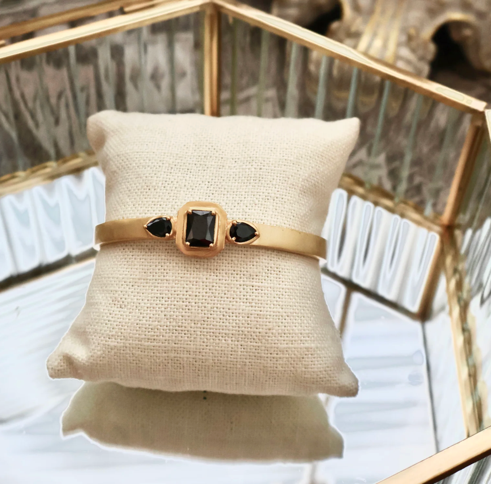 A beautiful gold cuff featuring a bold center stone flanked by two pear-cut stones for a balanced, elegant look. With its sleek open-cuff silhouette, this bracelet blends modern design with timeless sophistication. Perfect for dressing up everyday style or adding polish to evening wear. It is available in two colors: brown and black. It looks great paired with our Catherine Hoops and stacked with our Sophie cuff in the same stone options