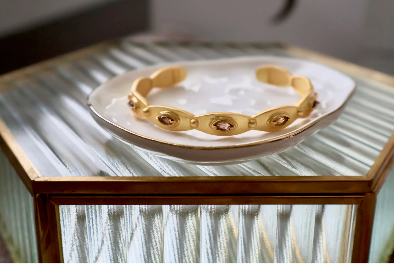 The most perfect scalloped cuff in two new color options, brown and black. It coordinates perfectly with our Catherine Hoops and Sadie Cuff in the same stone options.
