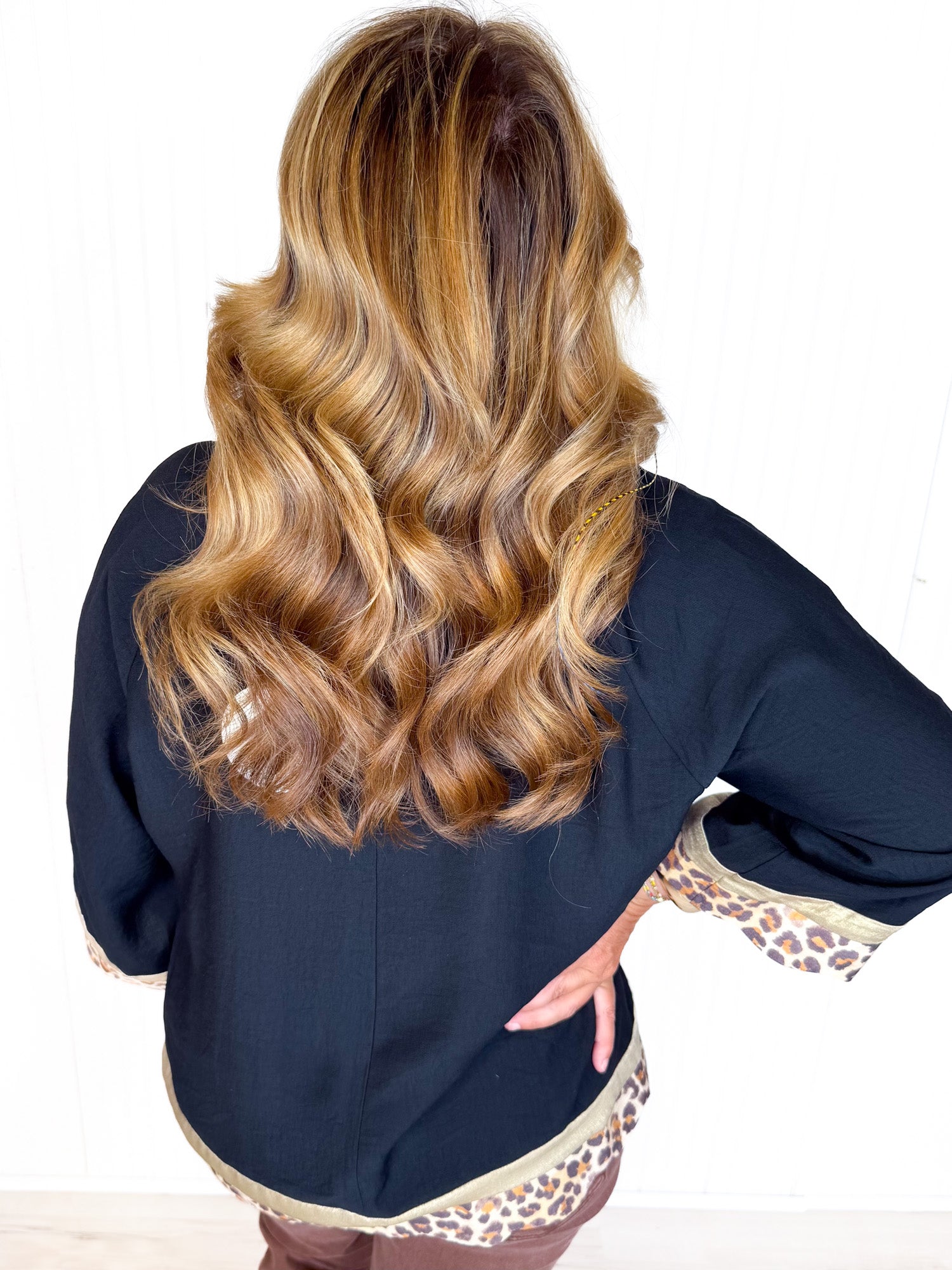 The Prowl In The Night Top is designed with a relaxed fit that makes it easy to wear for everyday style. It features wide sleeves that create a comfortable and modern look while allowing plenty of movement. The standout detail is the leopard print trim, adding just the right amount of contrast to the solid black base. Perfect for fall, this top can be dressed up or kept casual depending on your style. Pair it with jeans and flats for a simple and effortless outfit that is still polished and chic. This piece blends comfort with a touch of trend, making it a versatile addition to your wardrobe!