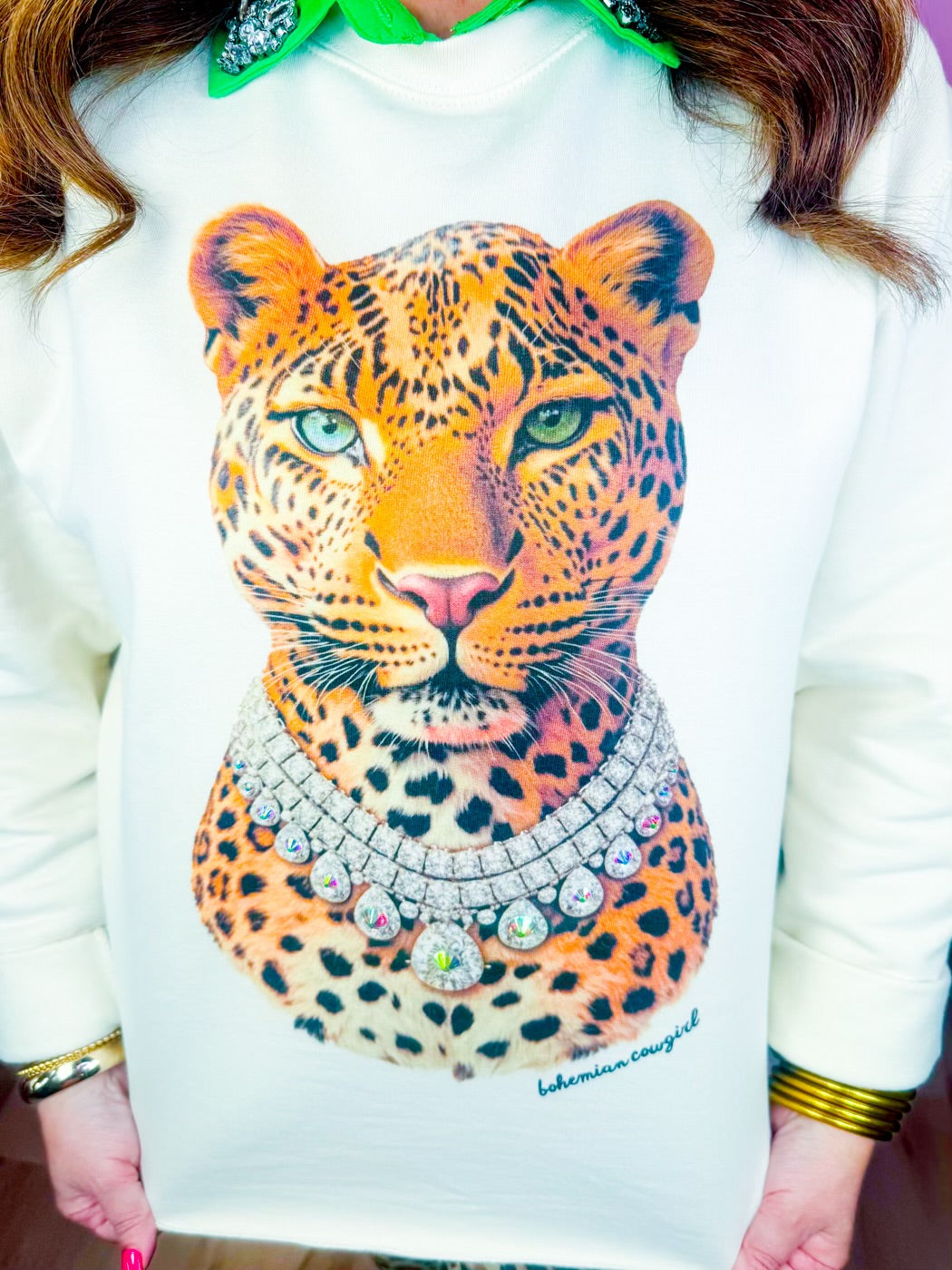 Leopard graphic wearing a diamond necklace with stone detailing
