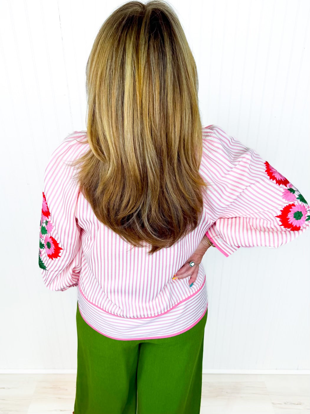The Graceful Garden Top brings sweet spring charm to your everyday wardrobe. Designed in a soft pink and cream stripe, this lightweight top features beautifully embroidered floral sleeves that add a delicate, feminine touch. The flattering split neckline creates an easy, relaxed silhouette while the breathable 65% polyester and 35% cotton blend keeps you comfortable all day long. Perfect for pairing with denim, white pants, or skirts, this top transitions effortlessly from casual outings to dressier occasions with timeless elegance.