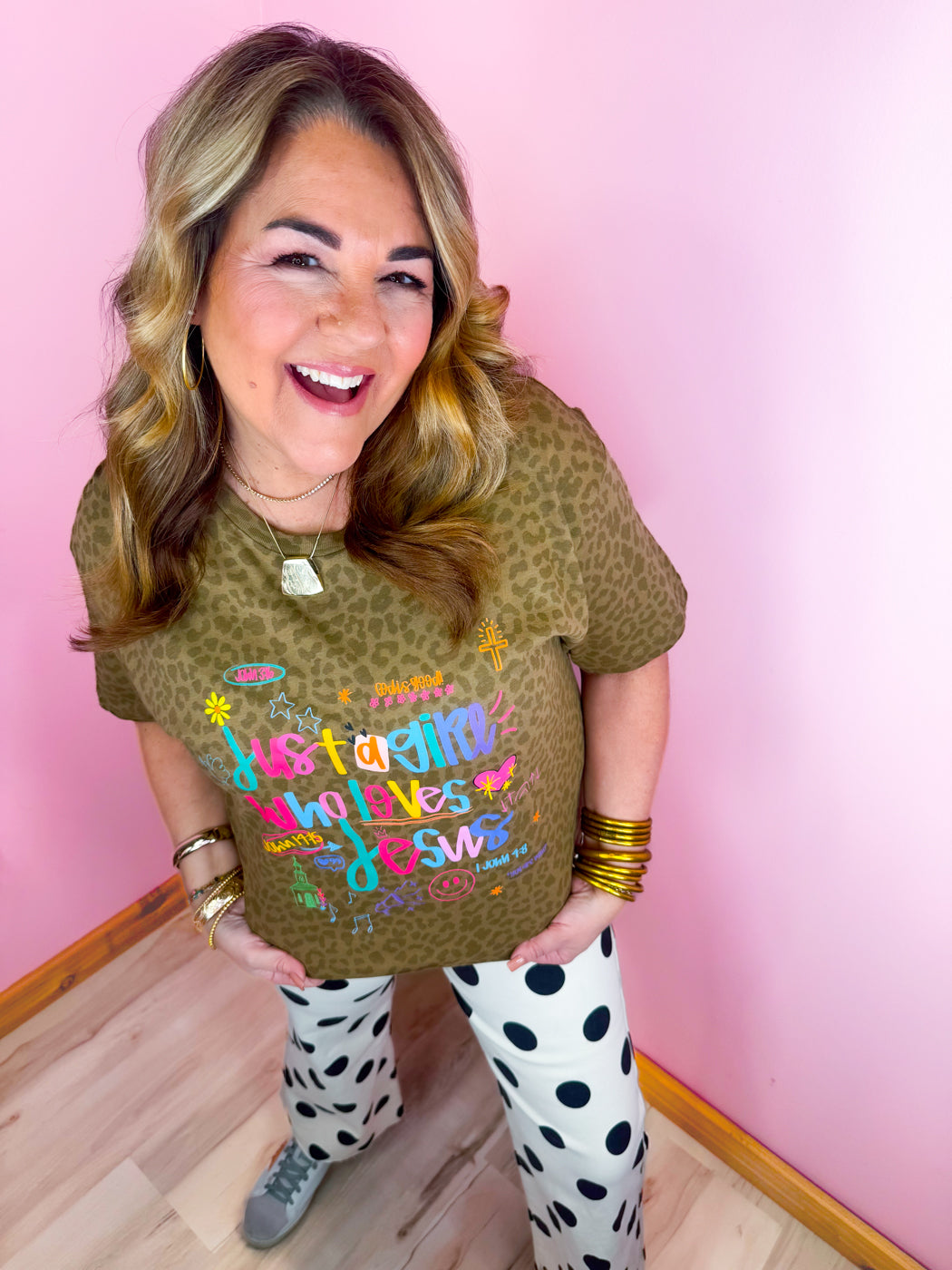 Show your faith in style with the Just a Girl Who Loves Jesus Tee from Live and Teal. Made from 100% soft cotton, this comfy tee features a playful leopard print design and a relaxed fit that’s perfect for everyday wear or layering with your favorite jackets and accessories.